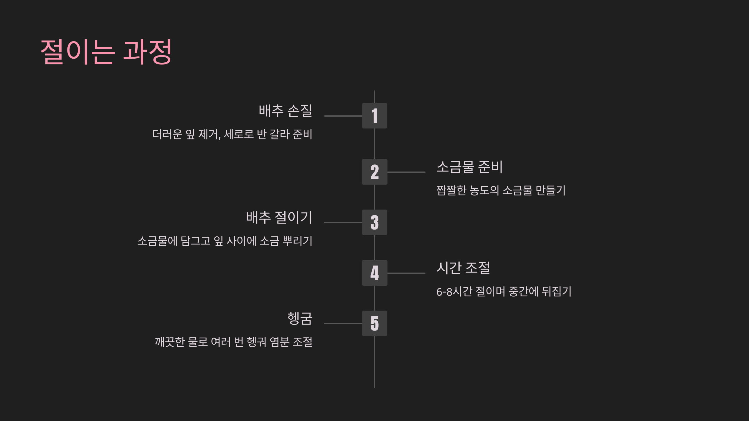 - 시간 조절: 6~8시간 동안 절이되, 중간에 배추를 뒤집어 고르게 절여지도록 합니다.