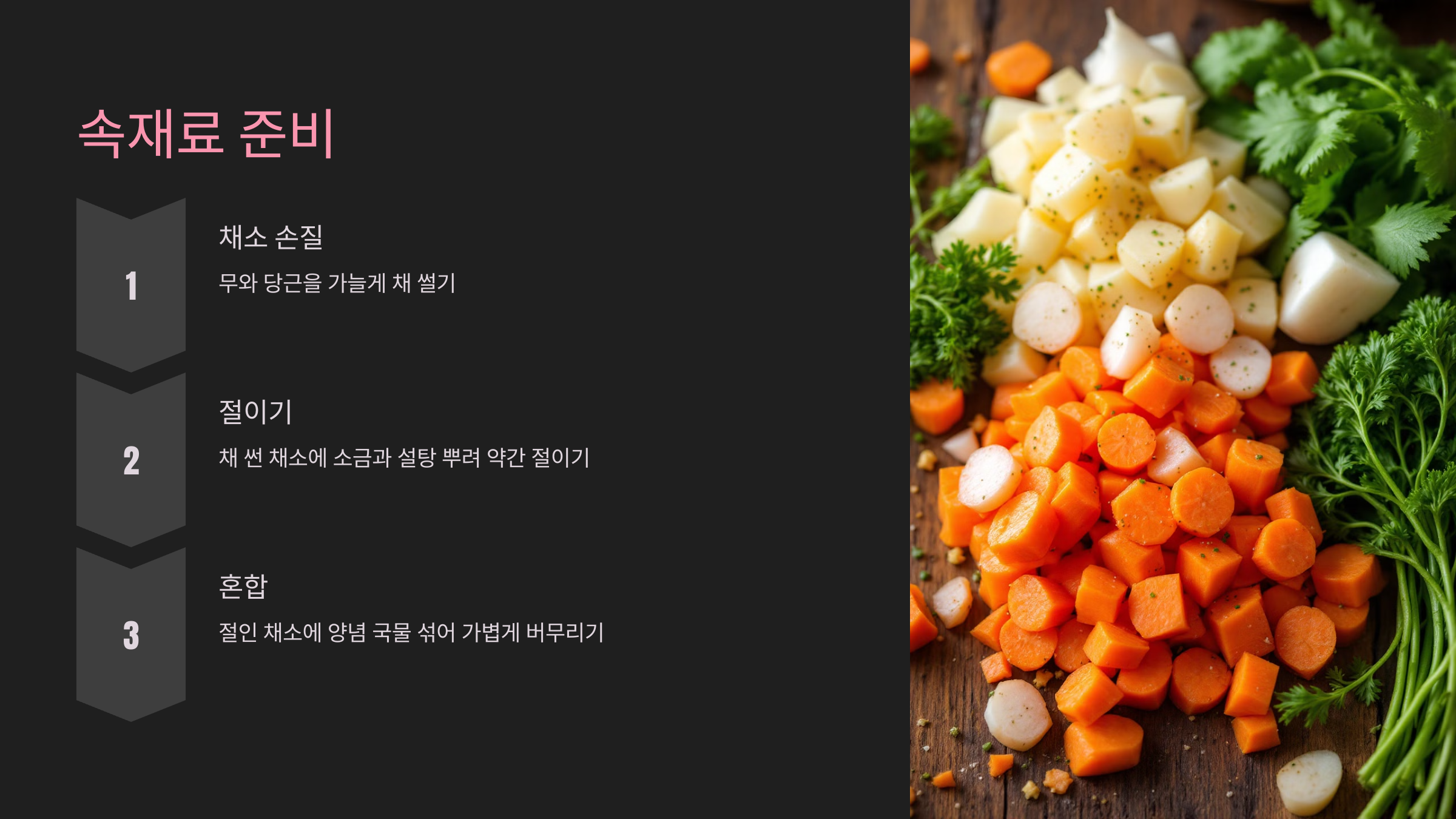 1. 채소 손질: 무와 당근을 가늘게 채 썹니다. 이 외에도 부추나 미나리를 추가해도 좋습니다.