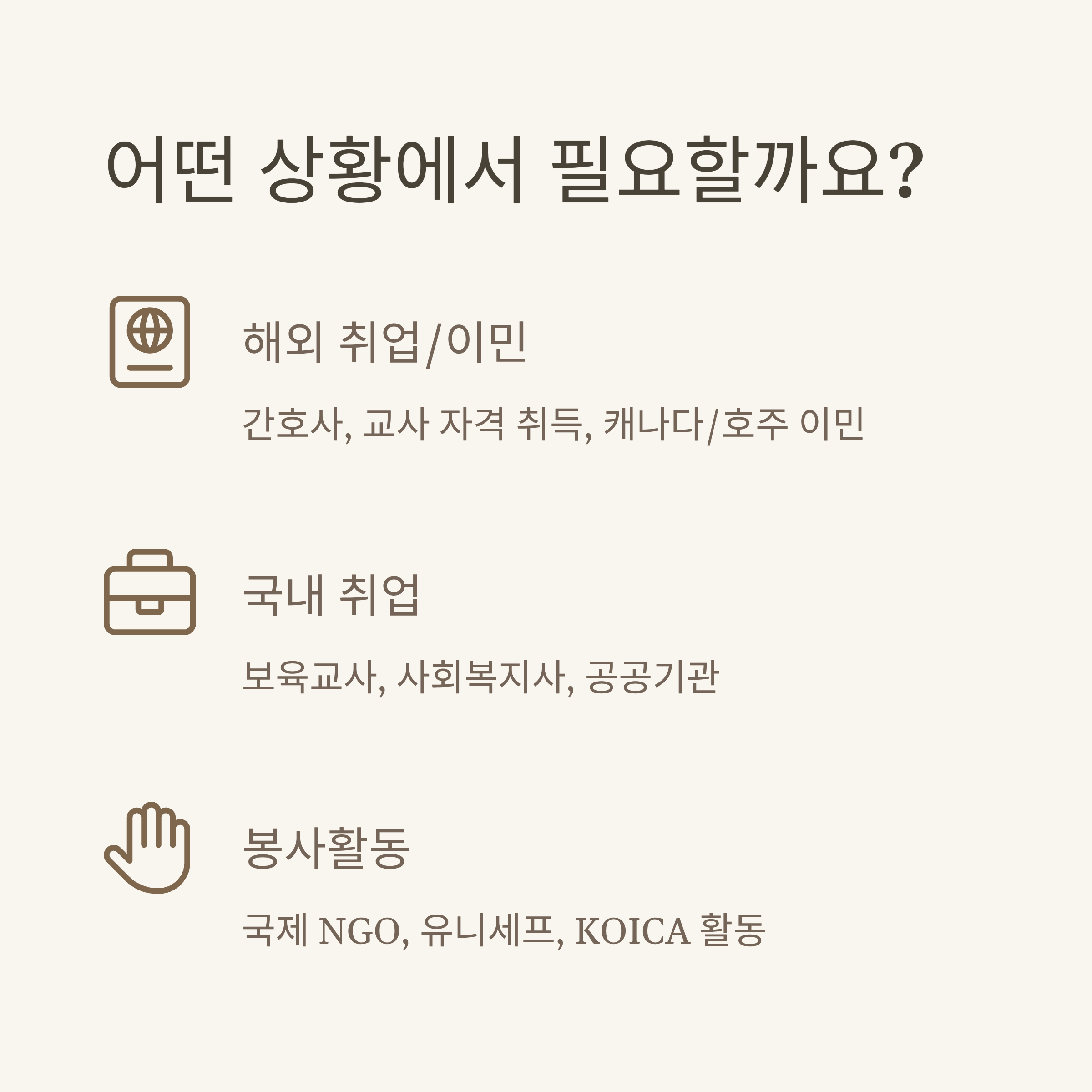 예를 들어, 외국에서 간호사나 교사 자격을 신청하려는 경우 해당 국가의 정부기관은 신청자의 범죄 경력을 꼼꼼히 확인하길 원해요. 이때 공신력 있는 한국 경찰청이 발급한 범죄·수사경력 회보서가 필수 서류로 요구되죠. 영문 서류가 필수인 경우가 많기 때문에 발급 신청 시 '영문 발급' 체크는 잊지 말아야 해요.