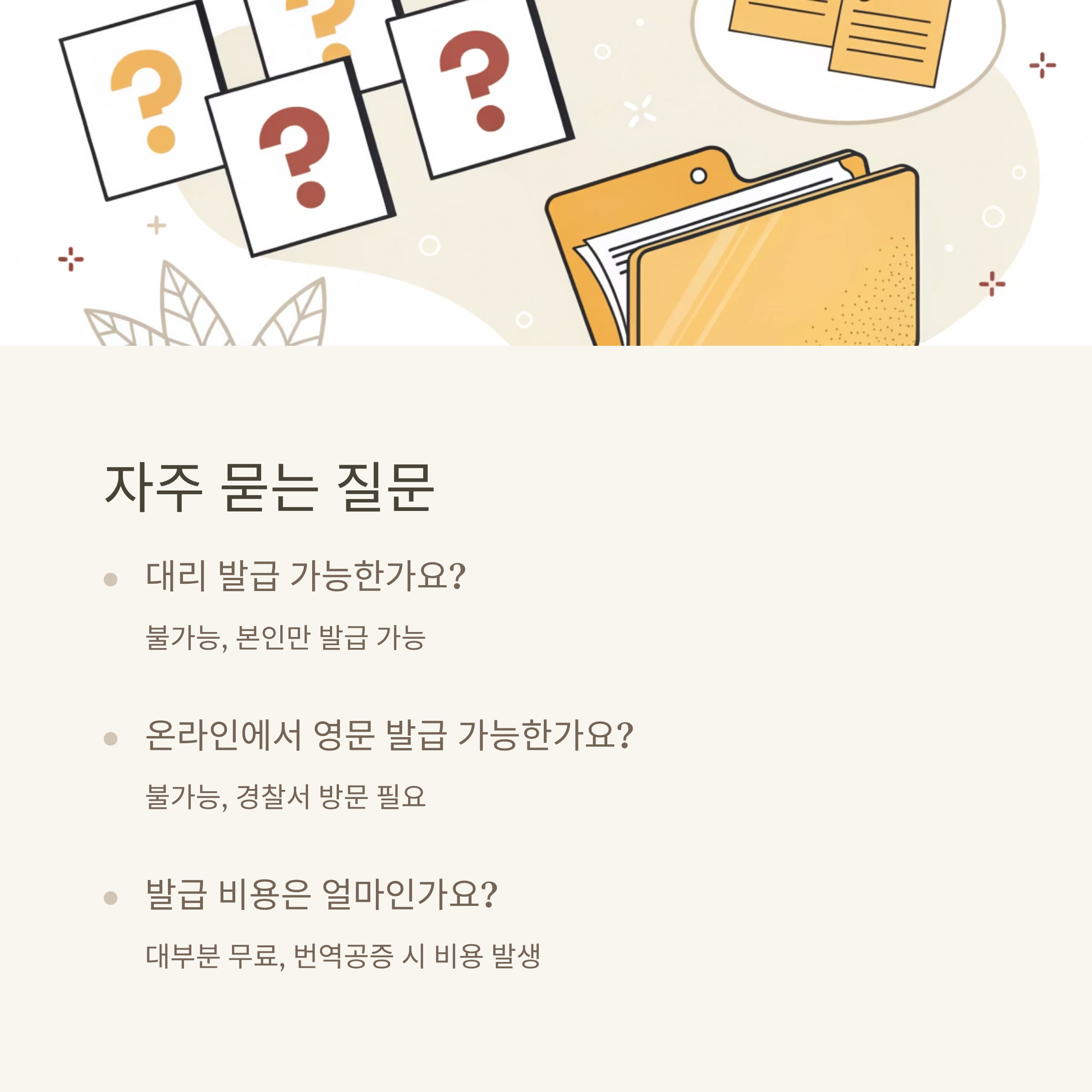 발급 수수료는 대부분 무료예요. 다만, 번역 공증이 필요한 경우에는 추가 비용이 발생할 수 있어요. 예를 들어 해외 이민국에 제출할 때 번역본과 공증본을 요구하는 경우가 많아요. 이때는 외부 기관을 통한 별도 절차가 필요하니 참고해 주세요. 🔐