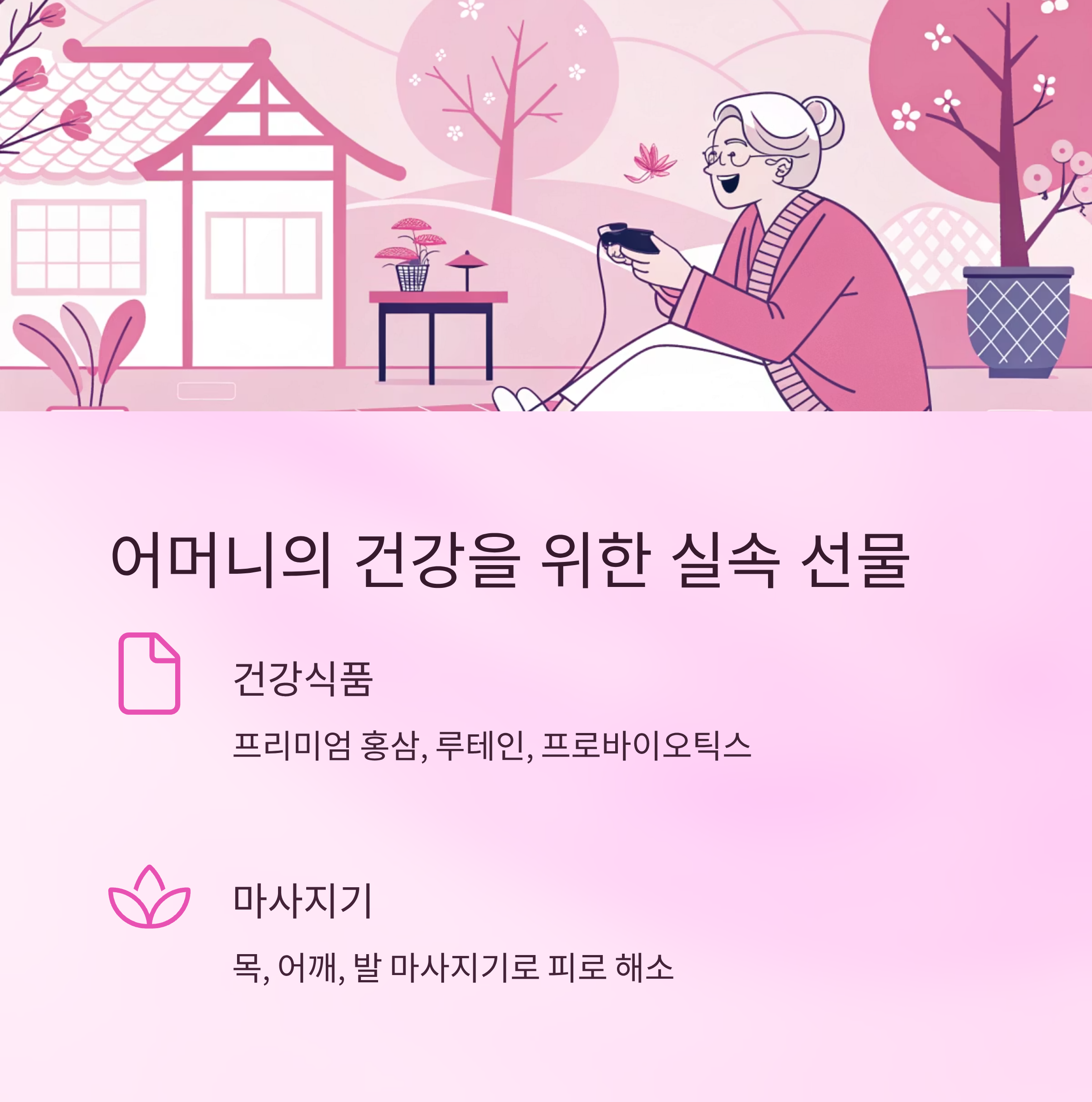 예전에는 부모님께 드리는 선물이라면 한우나 홍삼 같은 건강식품이 대부분이었어요. 명절이나 생신 때 챙겨드리는 단발성 선물들이 중심이었고요. 하지만 요즘은 사소한 날에도 부모님께 선물을 드리는 문화가 점점 확산되고 있어요. 특히 젊은 세대를 중심으로, ‘작은 감사’를 자주 표현하는 게 중요하다는 인식이 늘고 있어요.