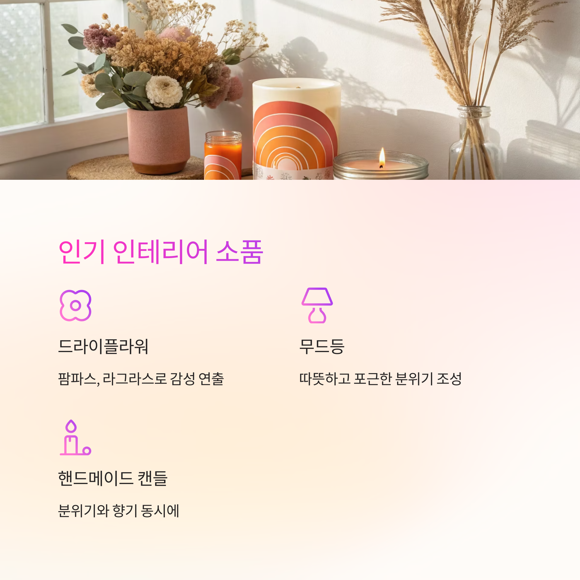 | 드라이플라워 | 감성 연출 | 침실, 거실 | 5,000~20,000원 |