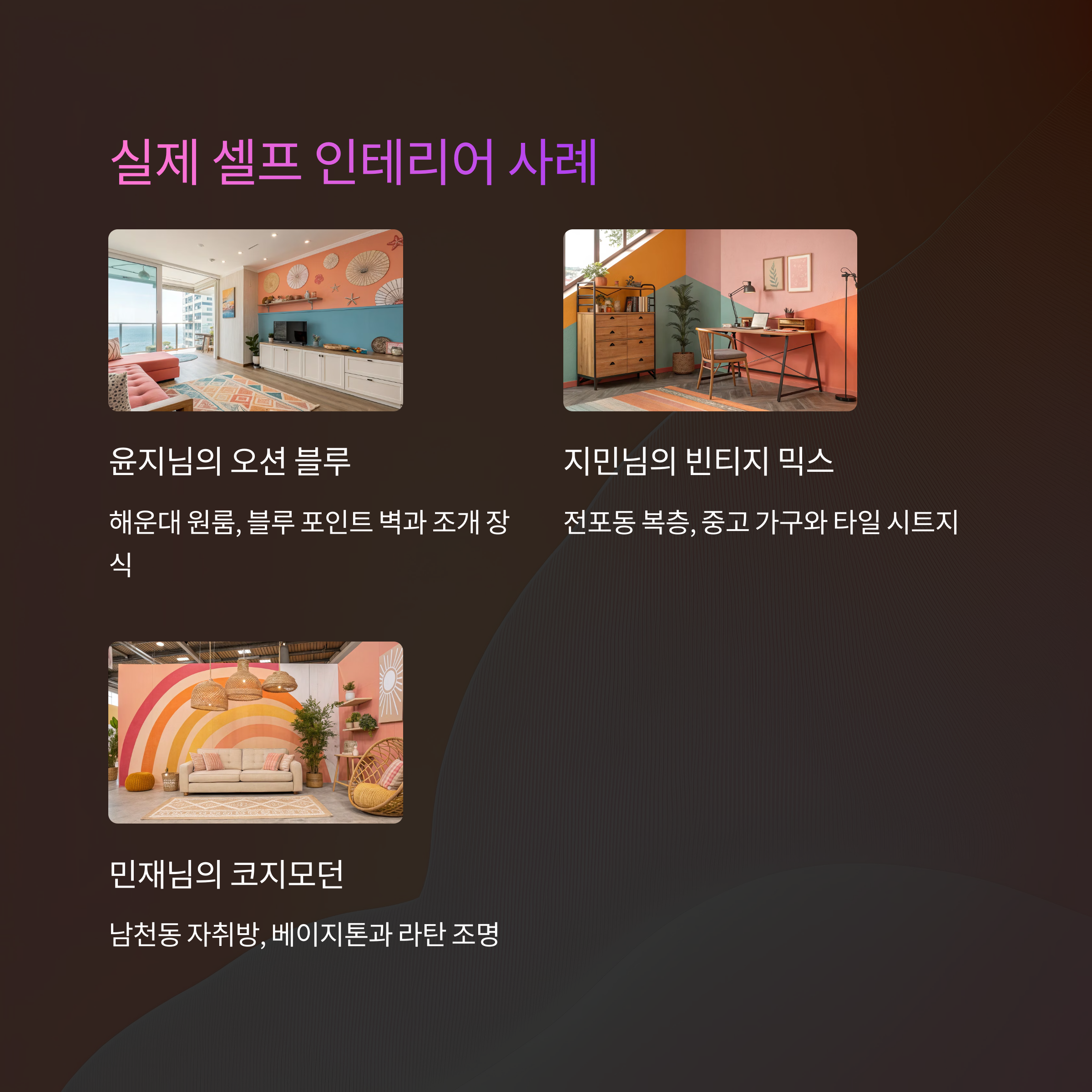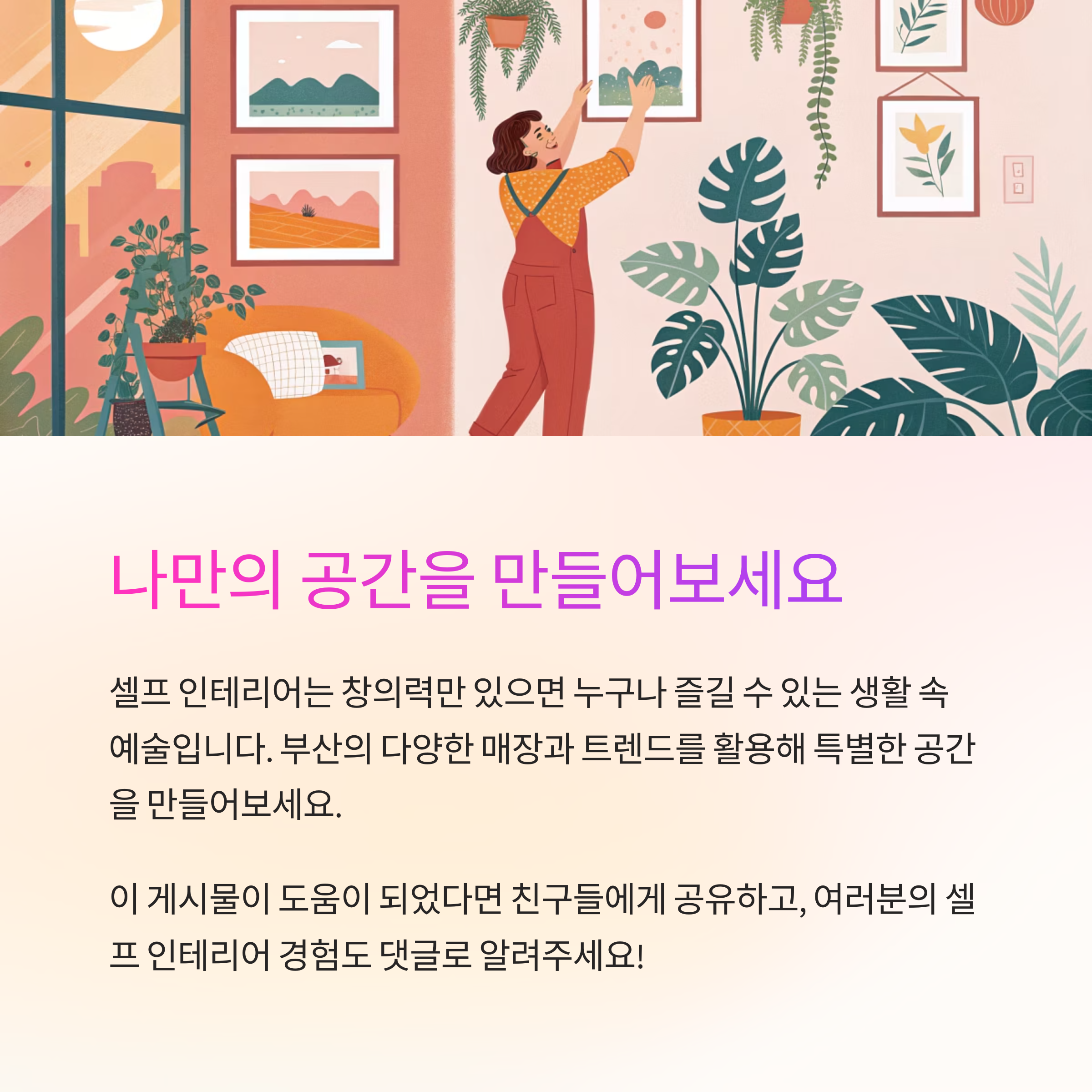 이처럼 부산에서는 다양한 공간과 스타일을 조화롭게 활용한 셀프 인테리어가 많아요. 직접 꾸민 사람들의 경험을 참고하면 나만의 공간 만들기도 훨씬 수월해질 거예요 😊