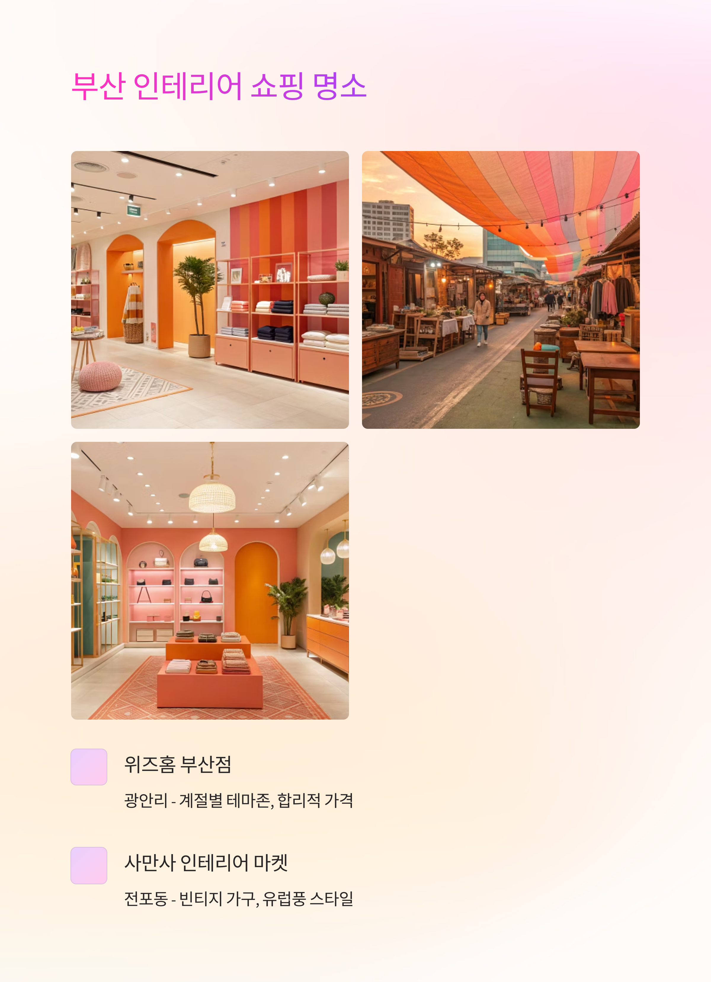 셀프 인테리어를 제대로 하려면 필요한 자재나 소품, 가구 등을 어디서 사야 할지도 중요하죠! 부산에는 다양한 콘셉트의 인테리어 매장들이 있어요. 오프라인에서 직접 보고 사는 걸 좋아하는 사람이라면, 전포동·광안리·대연동에 있는 셀렉트숍이나 창고형 매장을 추천할게요.