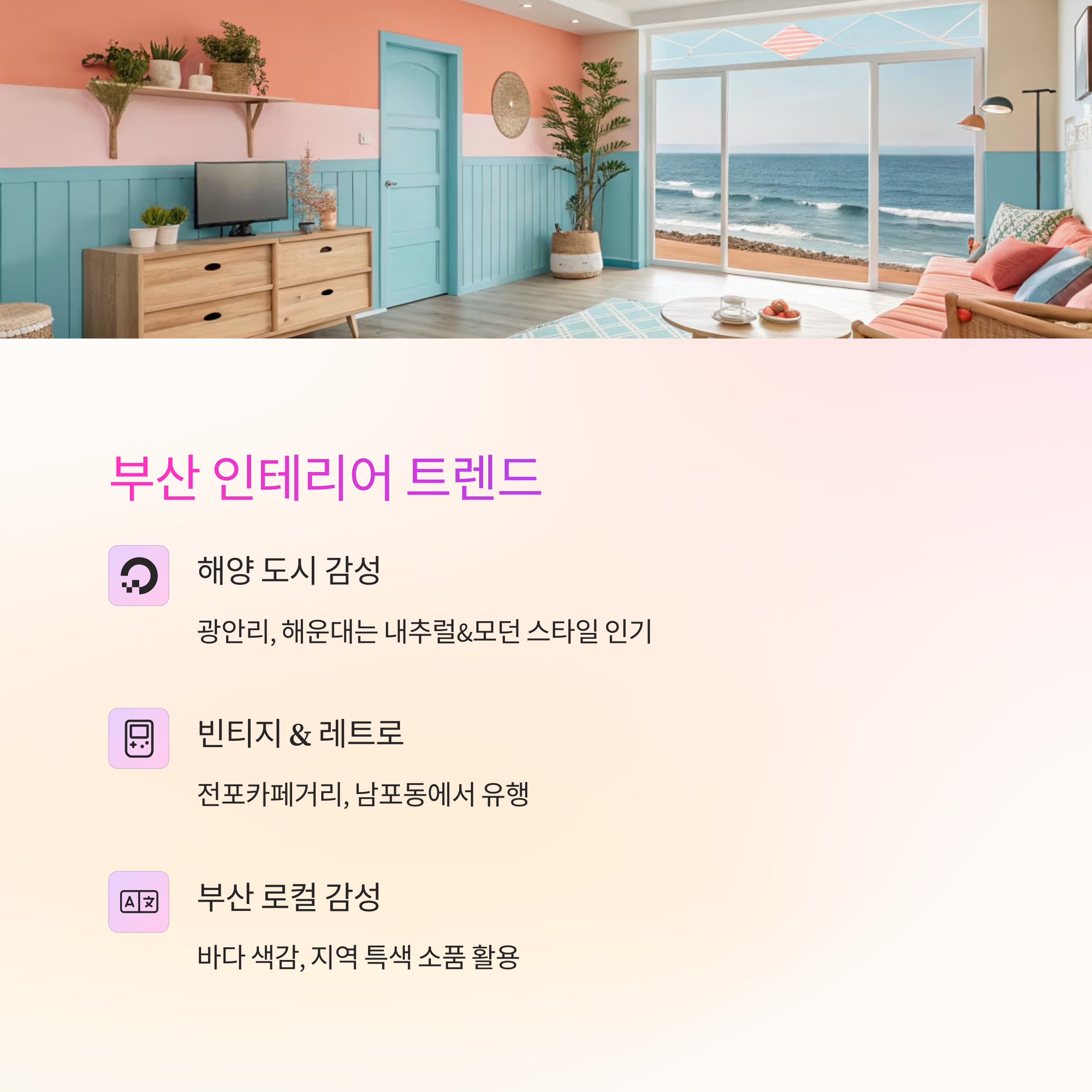 최근에는 '부산 로컬' 감성을 담은 인테리어도 주목받고 있어요. 예를 들어, 바다 색감에서 영감을 받은 푸른 계열의 포인트 벽지나, 자갈치시장에서 구한 특색 있는 소품을 활용한 연출이 인기를 끌고 있어요.