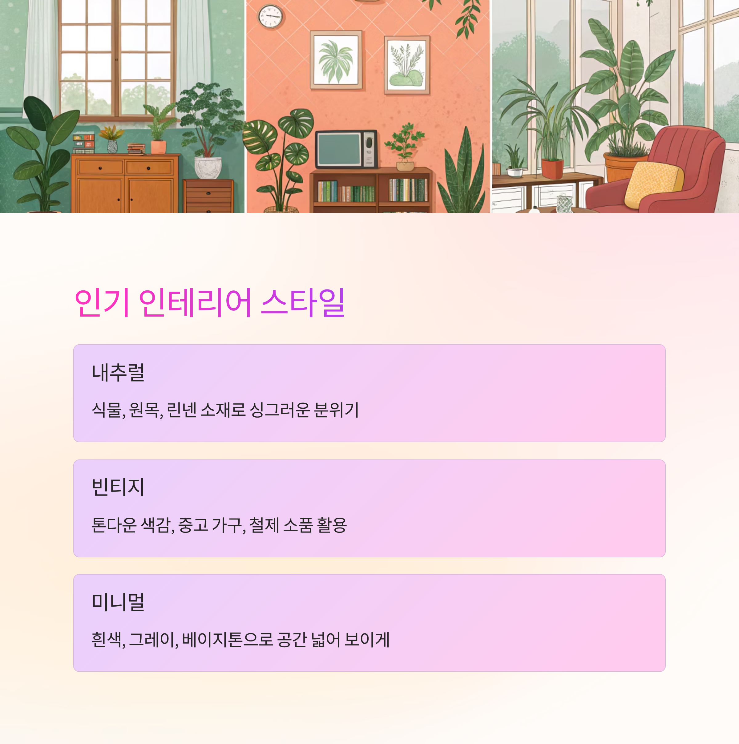 셀프 인테리어를 시작하려면 먼저 나에게 어울리는 스타일을 정하는 게 중요해요. 요즘 부산에서는 5가지 스타일이 특히 인기 많아요: 내추럴, 빈티지, 미니멀, 코지모던, 그리고 오션블루예요. 각 스타일은 분위기와 소품 선택이 완전히 다르기 때문에, 내 공간에서 어떤 느낌을 원하는지를 먼저 고민해 보면 좋아요.