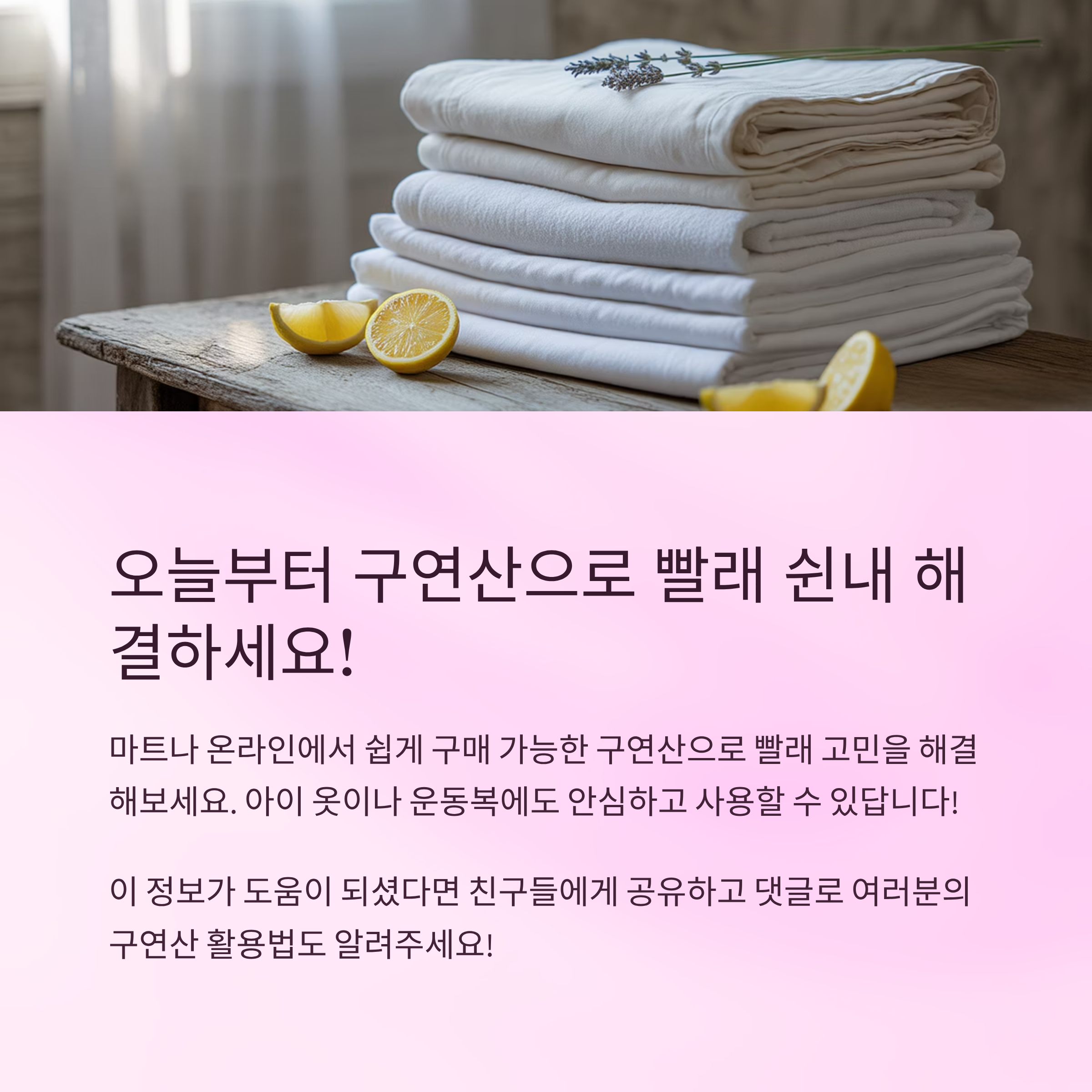 이처럼 구연산은 세탁은 물론, 집안 곳곳에서 활용할 수 있어요. 한 통 구비해두면 진짜 든든한 생활 아이템이 된답니다! 사용법만 알면 누구나 전문가처럼 활용할 수 있어요 😊