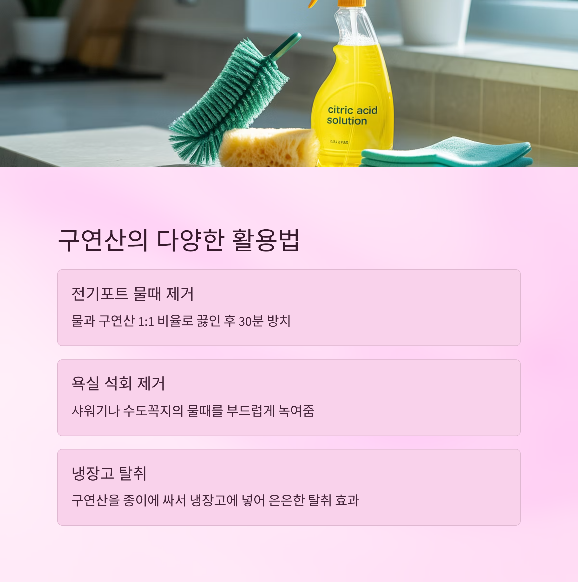 구연산은 빨래에서만 쓰기엔 너무 아까운 만능 아이템이에요. 생활 곳곳에서 활용할 수 있는 다양한 꿀팁이 많답니다. 특히 주방과 욕실에서 빛을 발해요. 여기서부터는 구연산을 활용한 실생활 응용법을 소개해볼게요.
