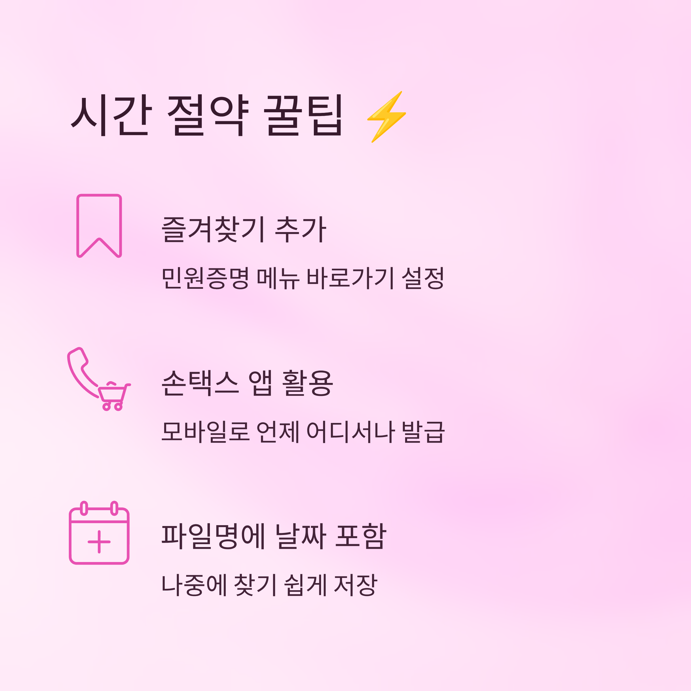 사업자등록증 발급을 더 빠르게 하려면 홈택스 로그인 후 '민원증명' 메뉴를 즐겨찾기에 추가해 두는 게 좋아요. 이렇게 하면 매번 메뉴를 찾을 필요 없이 바로 접근 가능하죠.