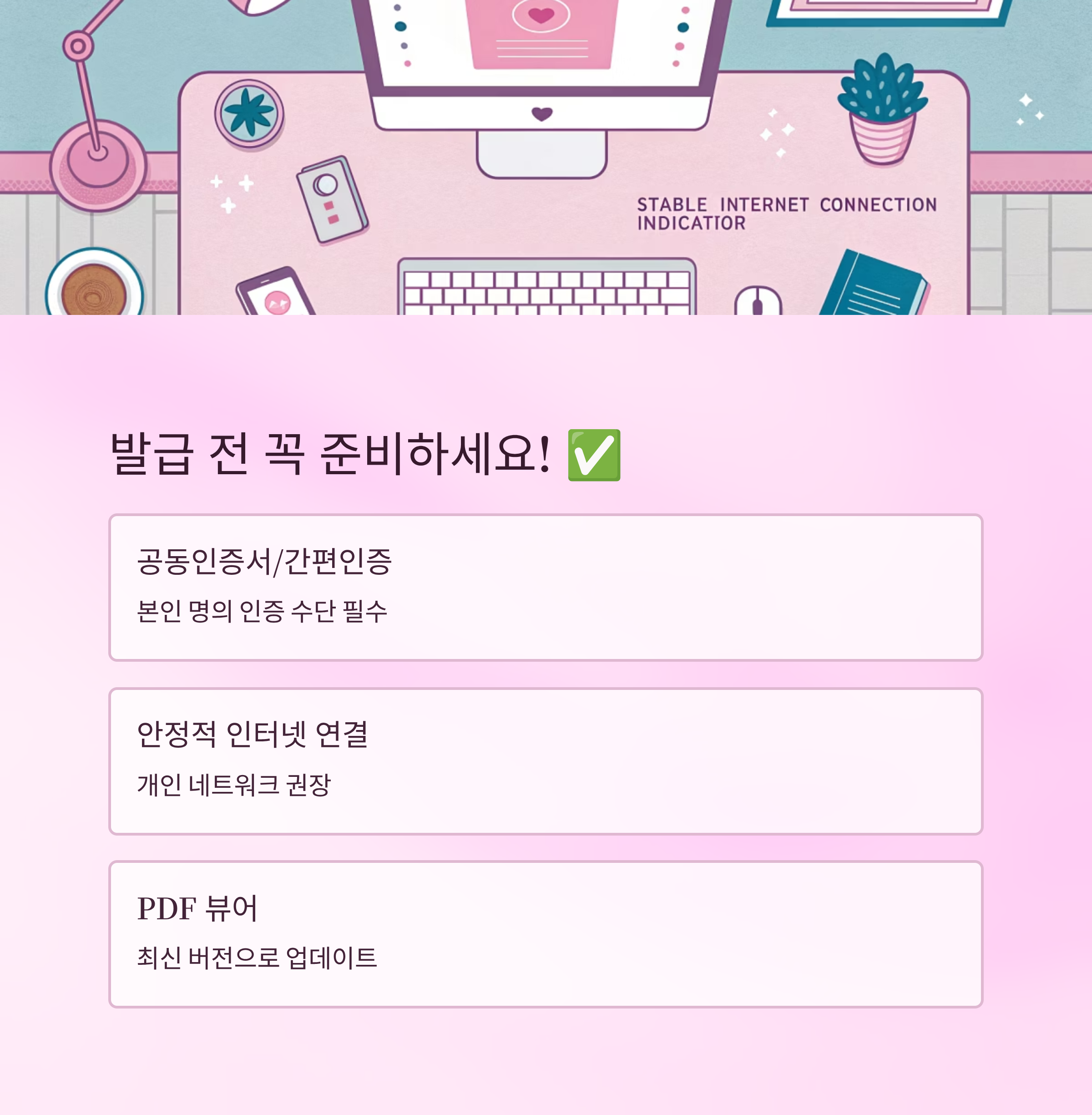 또한 인터넷 환경이 안정적이어야 해요. 발급 도중 연결이 끊기면 처음부터 다시 신청해야 하니까요. 특히 공용 와이파이보다는 개인 네트워크를 사용하는 게 안전해요.