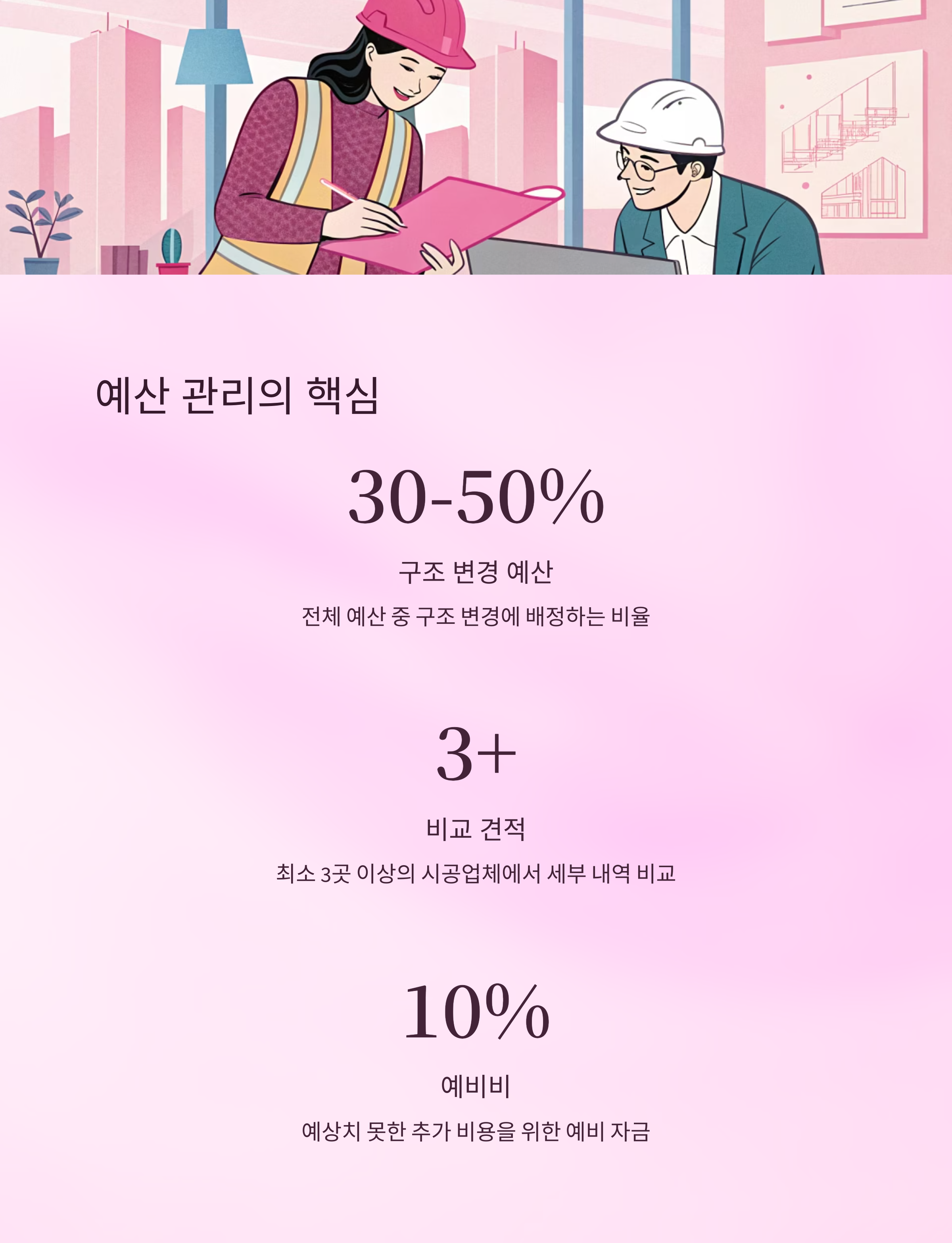 상가 리모델링의 구조 변경은 작은 오차도 큰 비용으로 이어질 수 있어요. 공사 예산은 전체 예산의 30~50%를 구조 변경에 배정하는 것이 일반적이에요. 특히 예상치 못한 철거 비용, 설비 이전 비용 등이 추가로 들어가는 경우가 많기 때문에 예비비 확보가 필수랍니다.