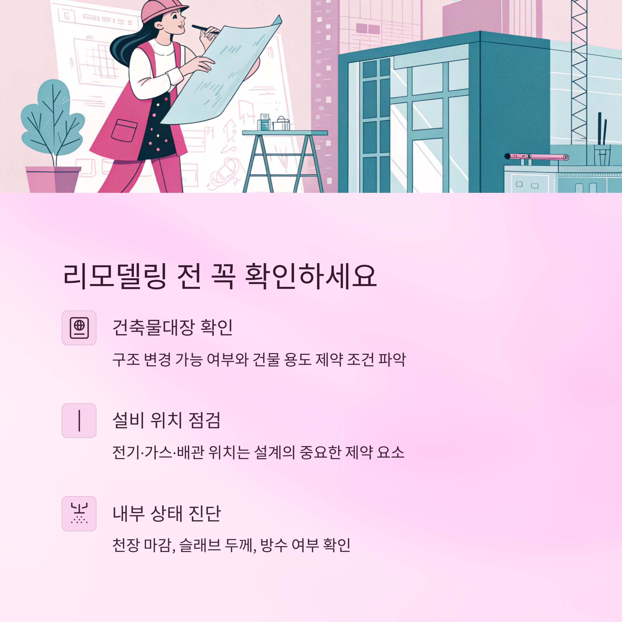 주방이나 화장실 구조 변경은 법규 제약이 크기 때문에 사전 인허가 확인이 중요해요. 특히 배관을 이동하려면 코어의 위치나 건물 구조에 영향을 줄 수 있으므로 반드시 전문 업체와 협의해야 해요.
