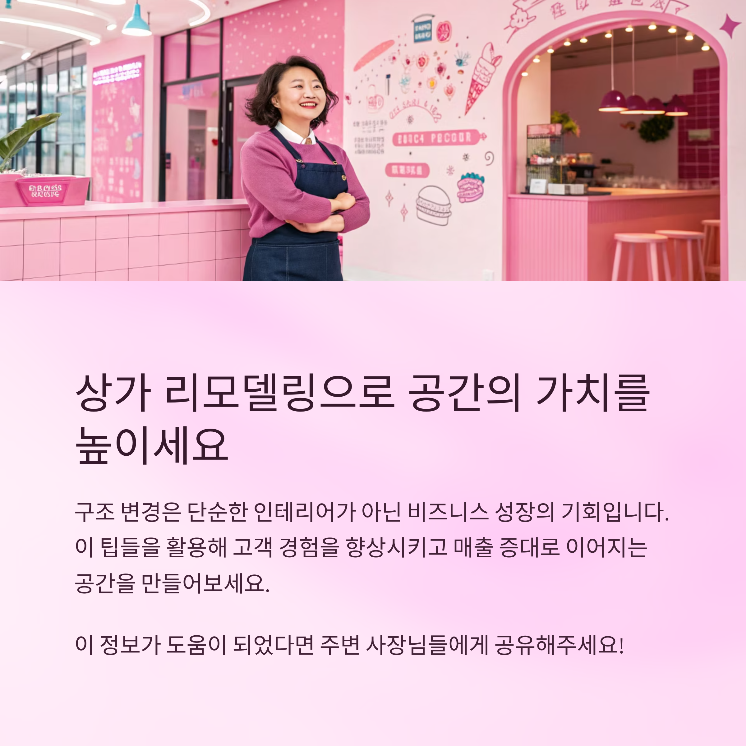 리모델링은 단순한 인테리어가 아니라 브랜드 이미지를 새롭게 리빌딩하는 기회라는 점을 기억하세요. 구조적 변화가 소비자 경험까지 연결되도록 콘텐츠 구성과 운영 방침을 함께 바꾸는 것이 좋아요.