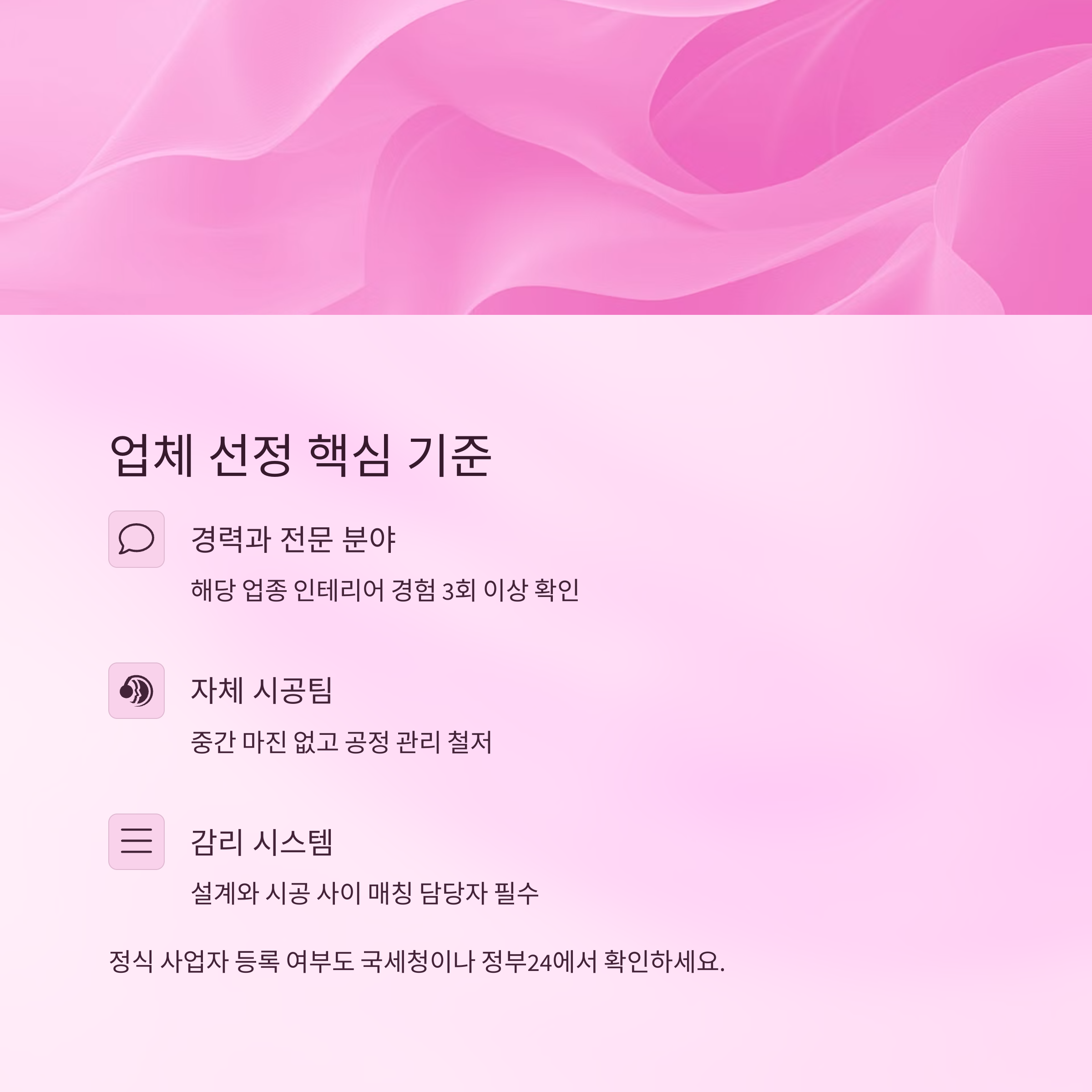 또한 인테리어 업체가 협력하는 전기 소방 통신 협력업체가 잘 구성되어 있는지도 중요해요. 특히 소방 허가가 필요한 경우, 협력업체가 따로 없으면 추가 비용이나 일정 지연이 생길 수 있어요.
