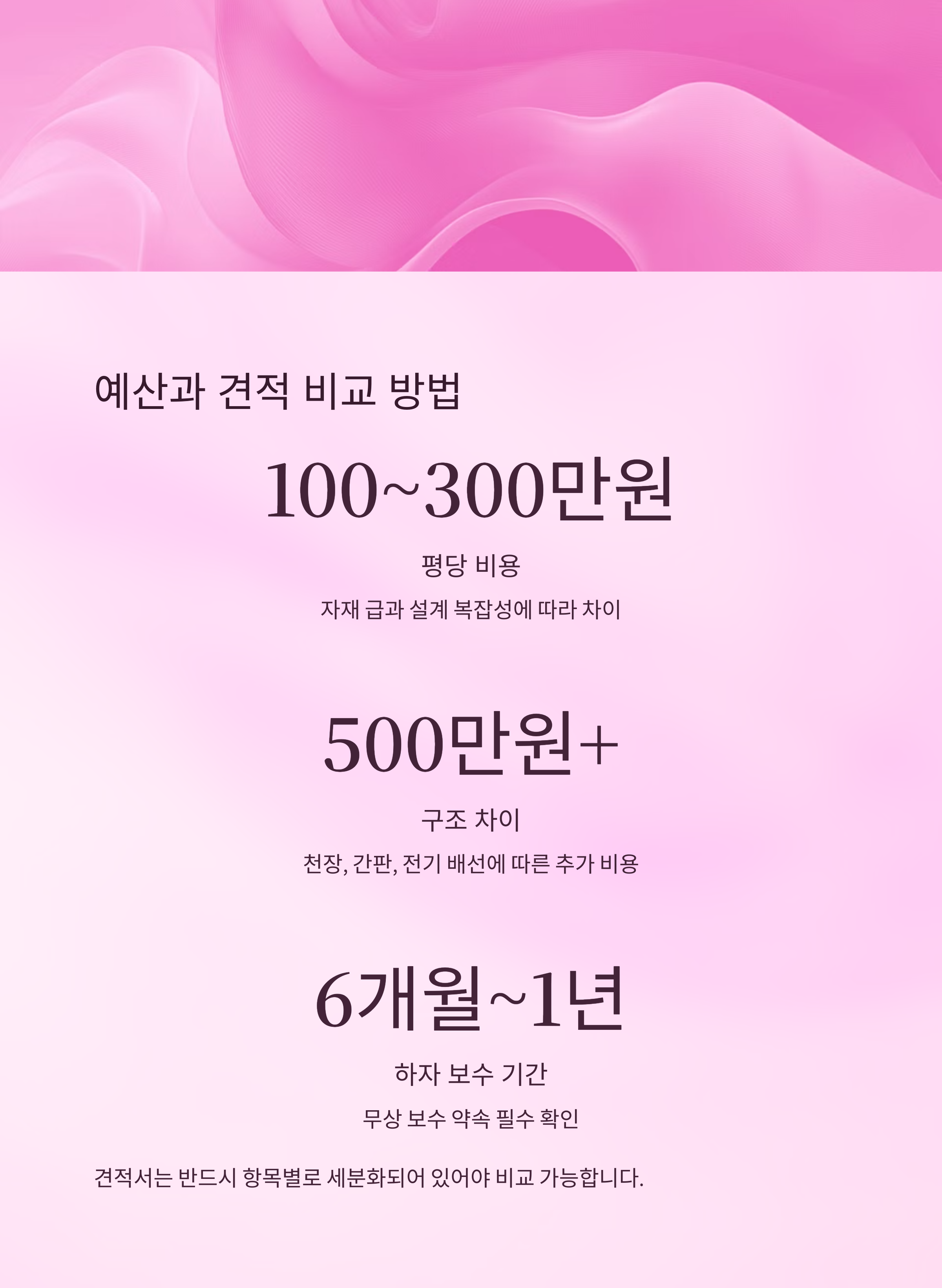 견적서를 받을 때는 반드시 상세 항목별 분리가 되어 있는지 확인해야 해요. 도장, 전기, 목공, 타일 등 각각 항목으로 나뉘어 있어야 비교가 가능하거든요. 뭉뚱그려 '20평 1,200만 원'이라고만 써있다면 피하는 게 좋아요.