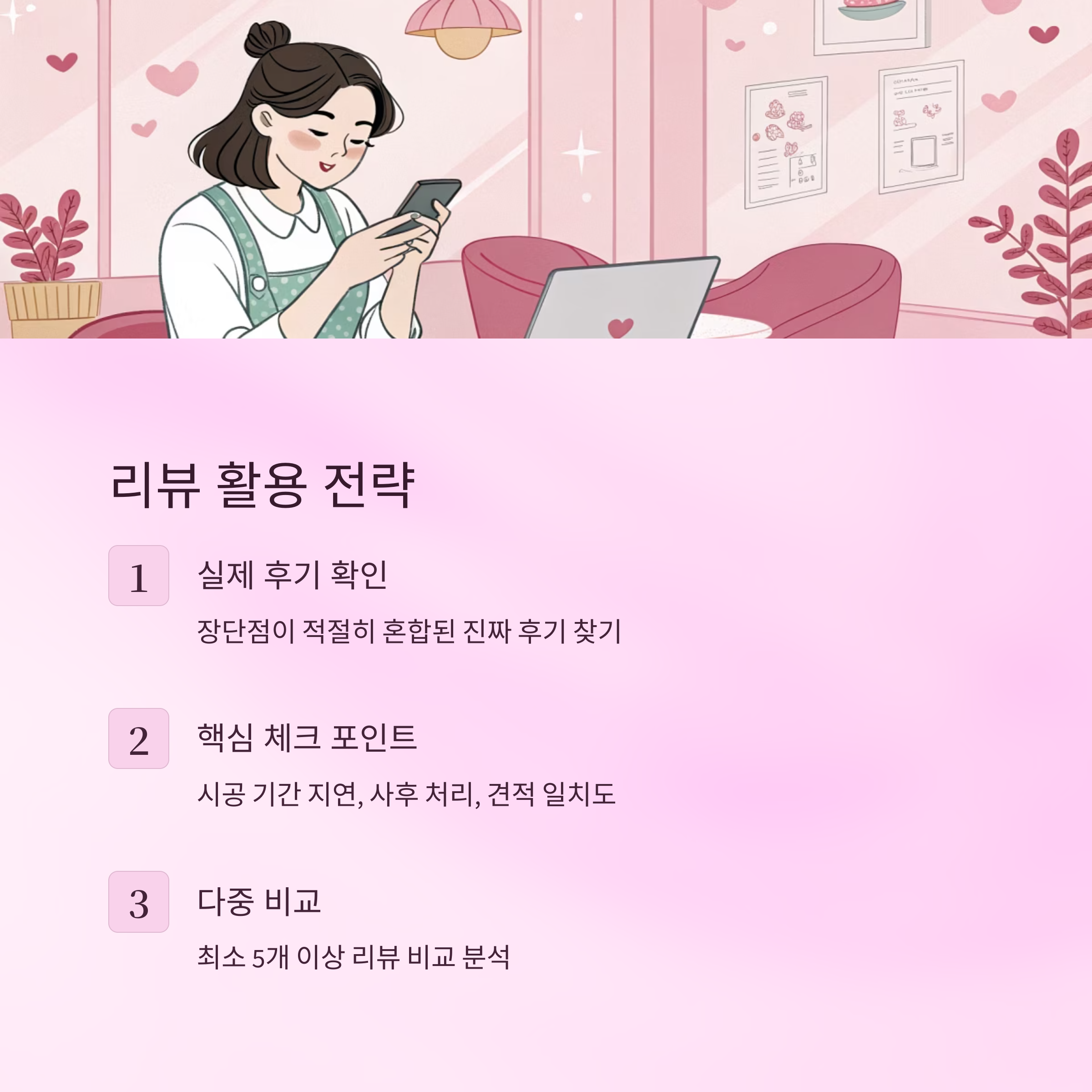 리뷰에서 꼭 봐야 할 포인트는 시공 기간 지연 여부, 사후 처리에 대한 반응, 견적과 실제 금액의 차이예요. 이 세 가지는 경험자만 이야기해 줄 수 있어요. 이게 업체의 ‘태도’를 엿볼 수 있는 기준이죠.