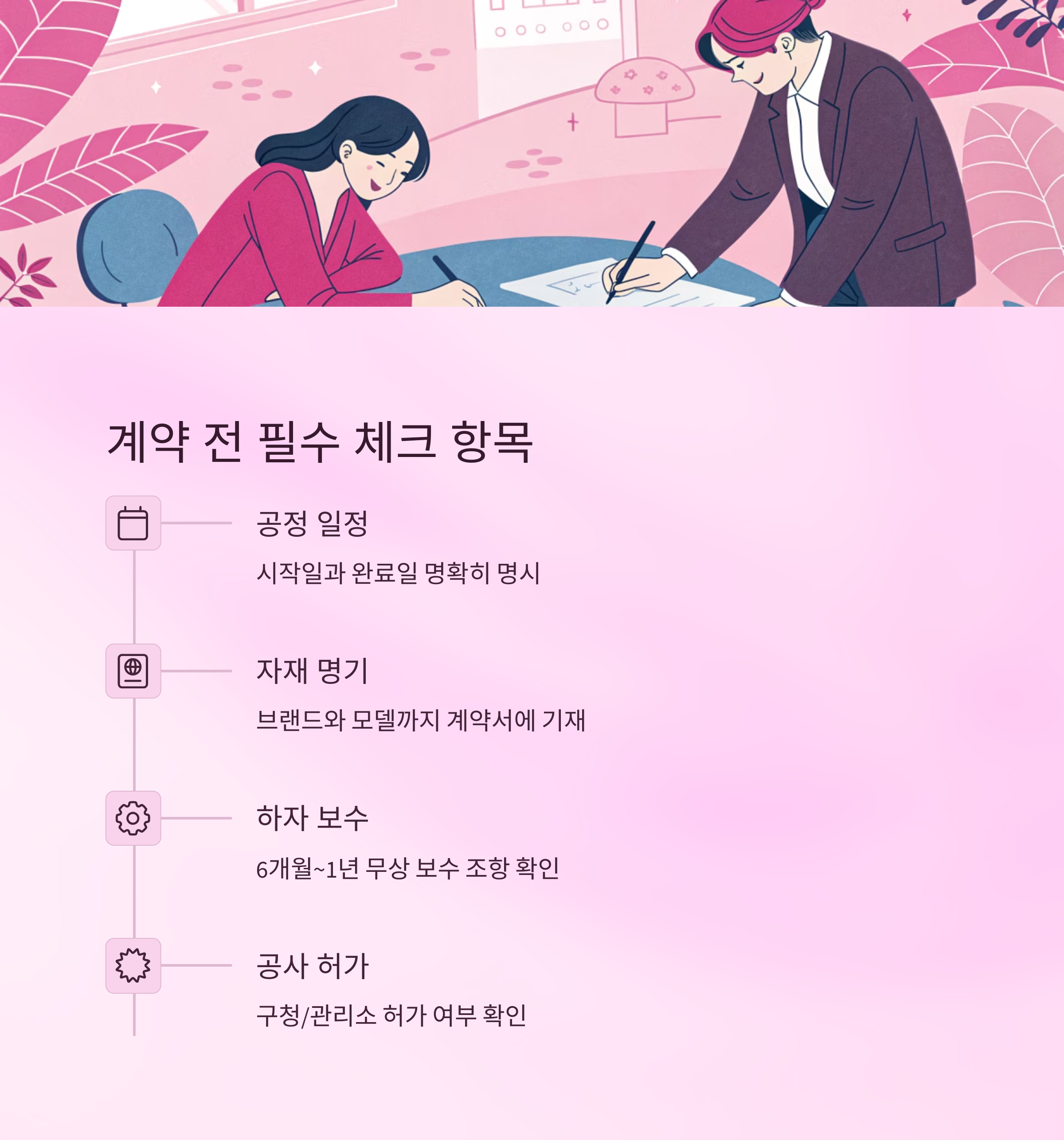계약 시 꼭 잊지 말아야 할 건 공사 전 허가 여부도 확인하는 거예요. 건물 구조 변경이 포함된다면 반드시 관리사무소나 관할 구청 허가가 필요할 수 있어요.