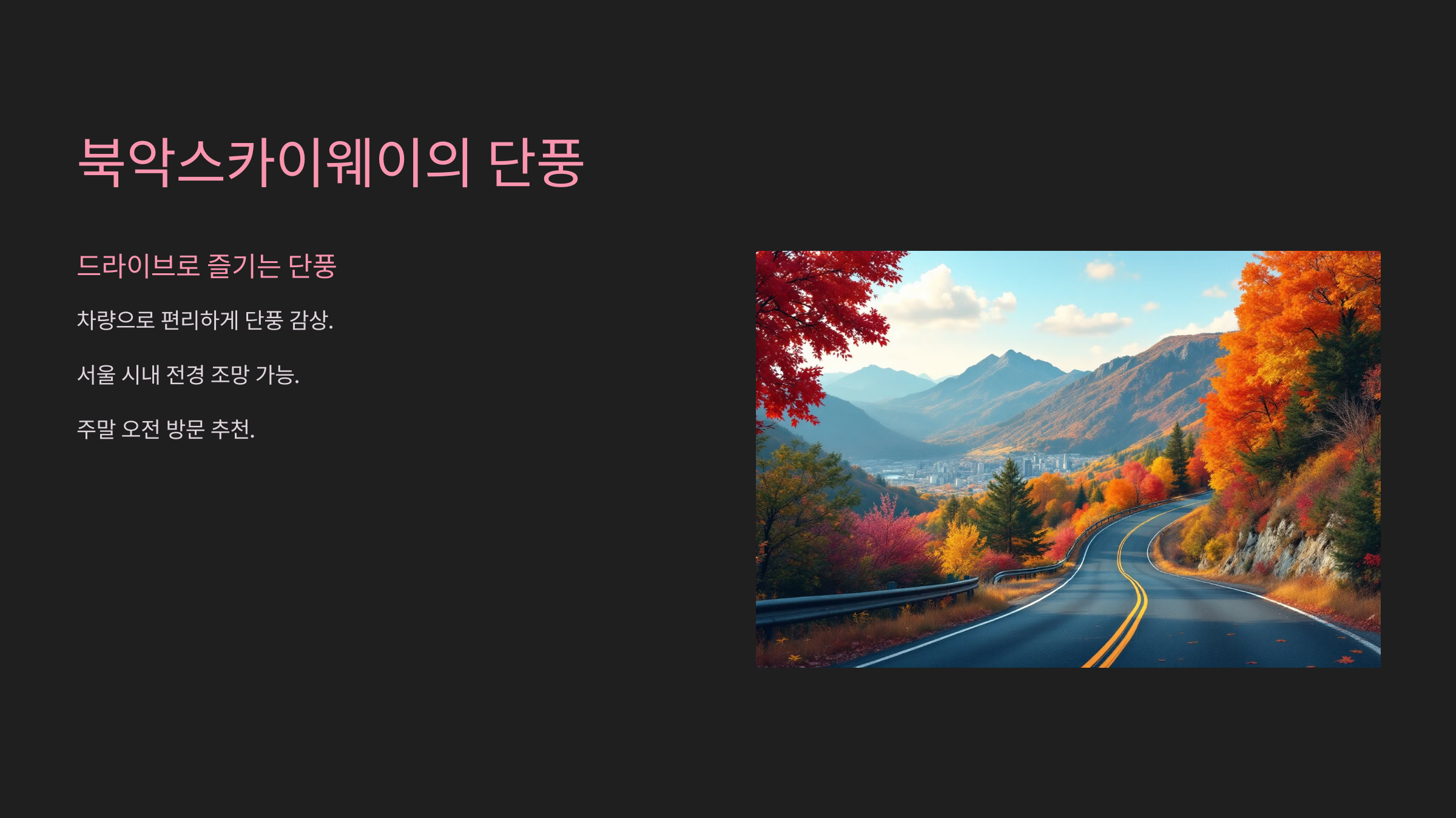 북악스카이웨이는 차량으로 편리하게 단풍을 감상할 수 있는 명소로, 길 양옆으로 단풍이 물든 풍경과 서울 시내를 한눈에 내려다볼 수 있는 뷰 포인트가 인상적입니다.