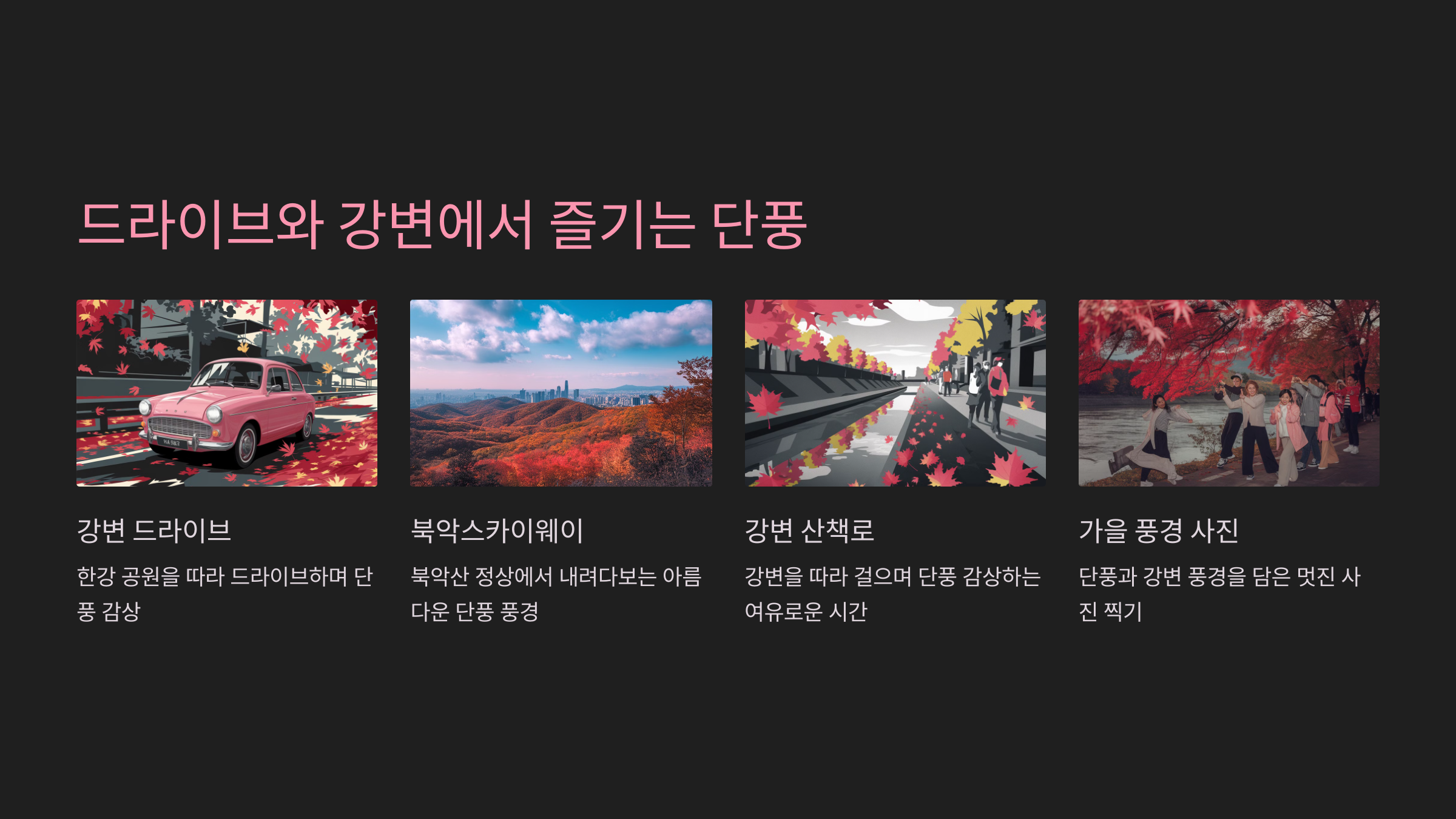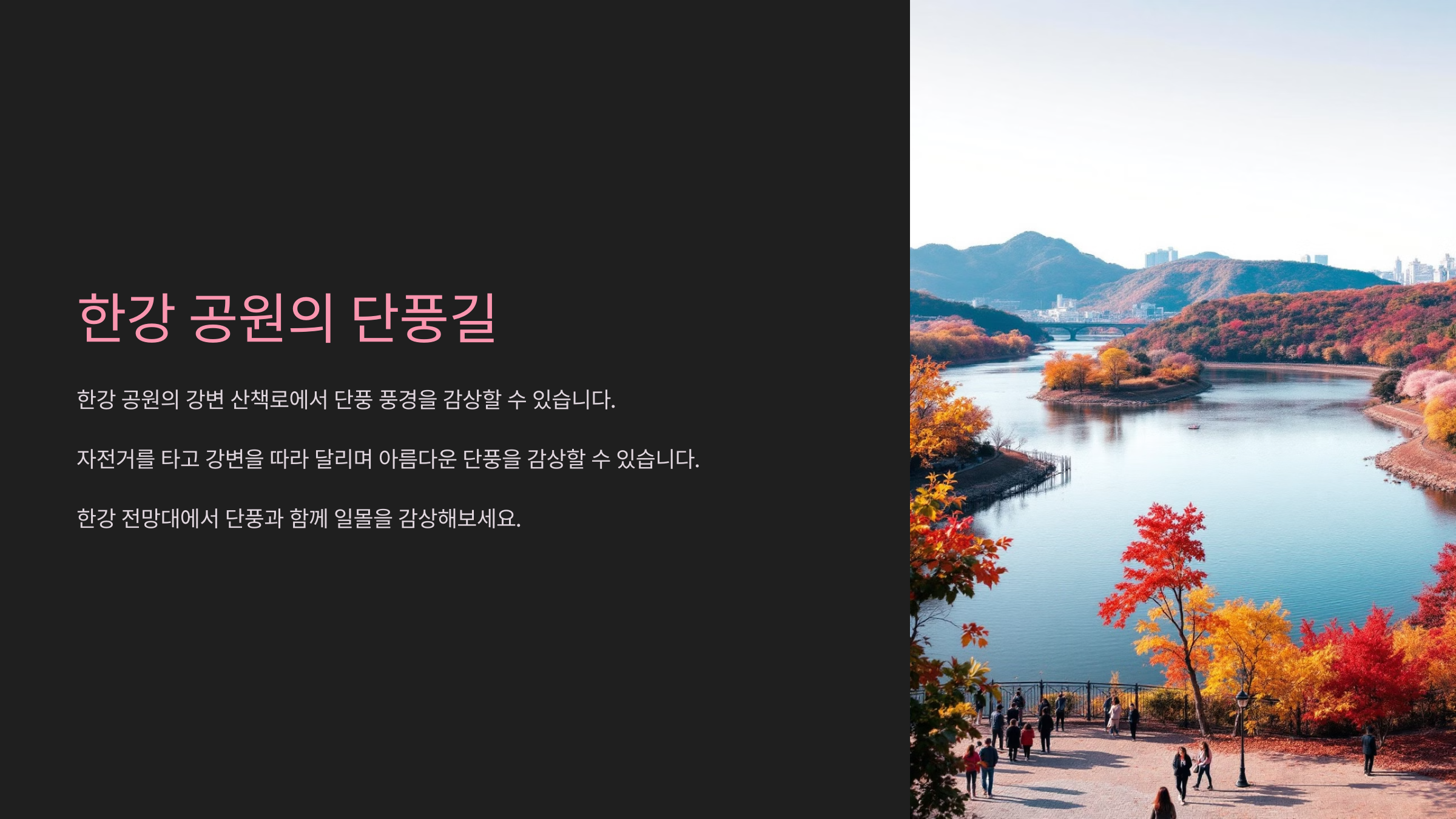 - 특징: 한강과 단풍의 조화로운 풍경.