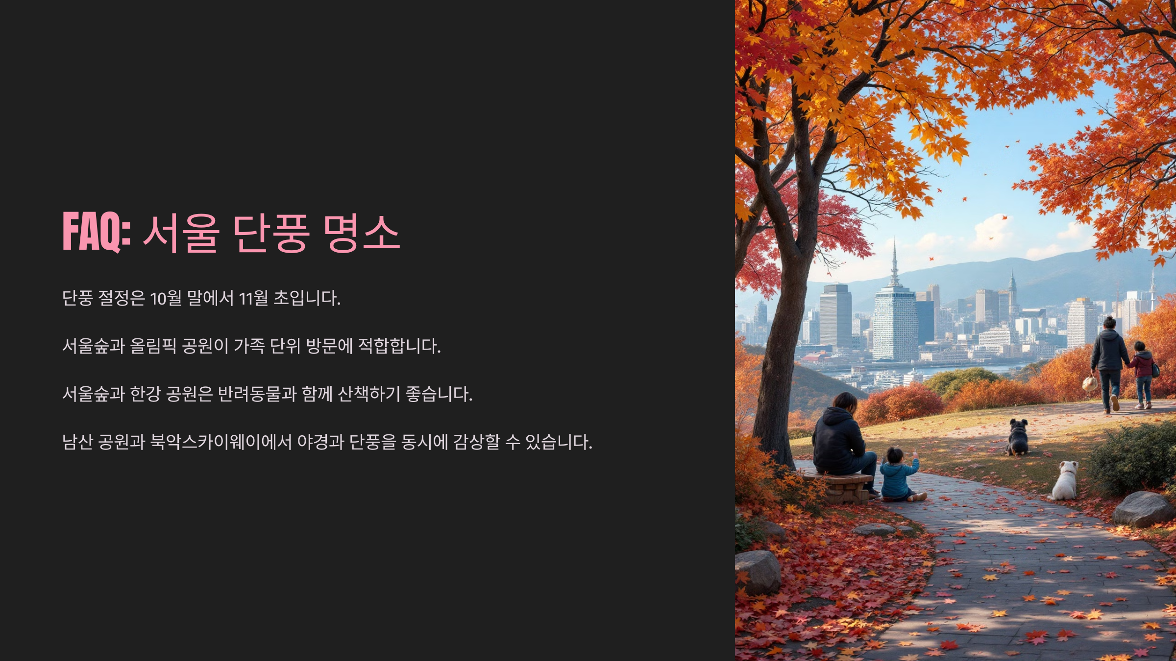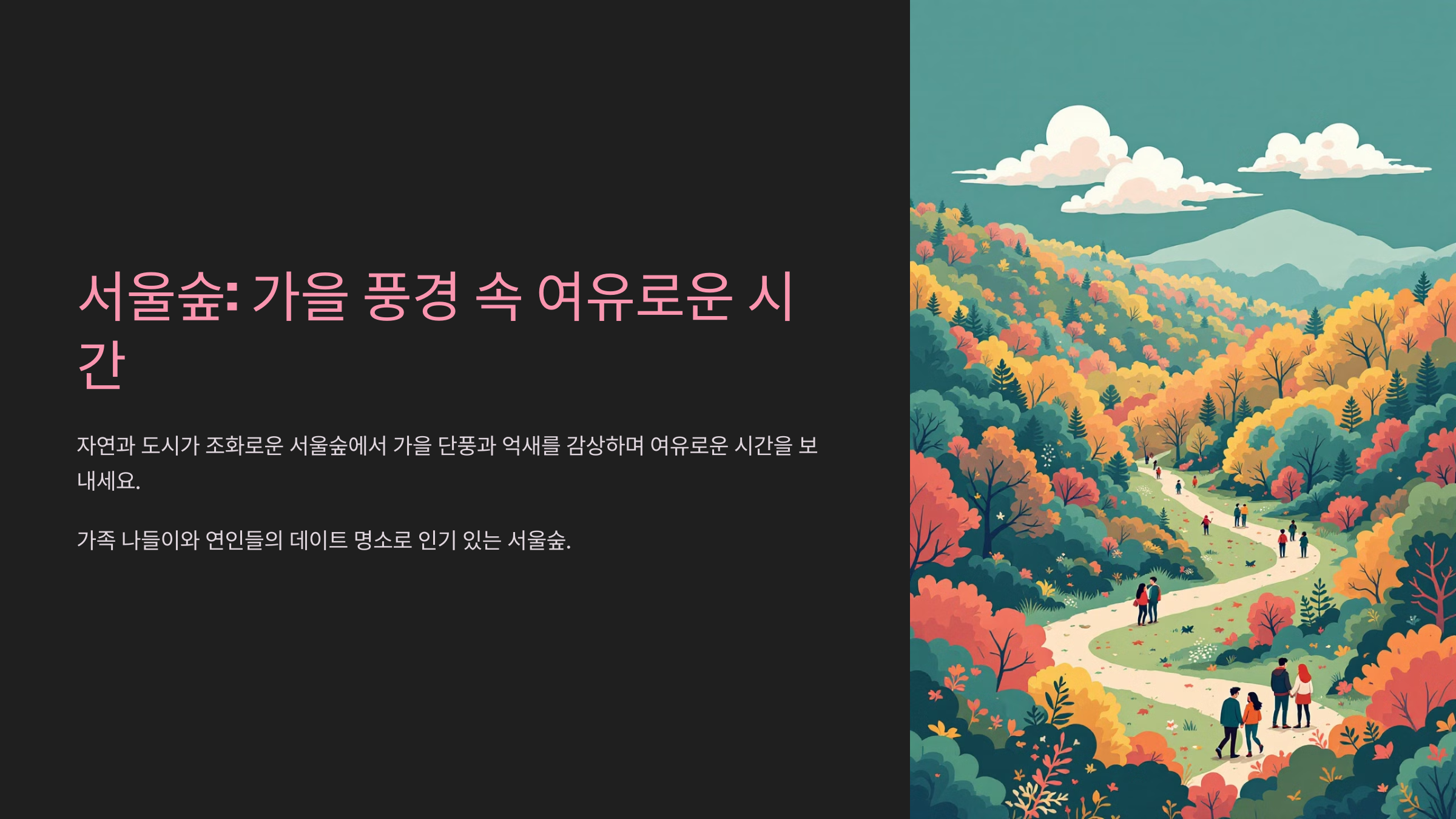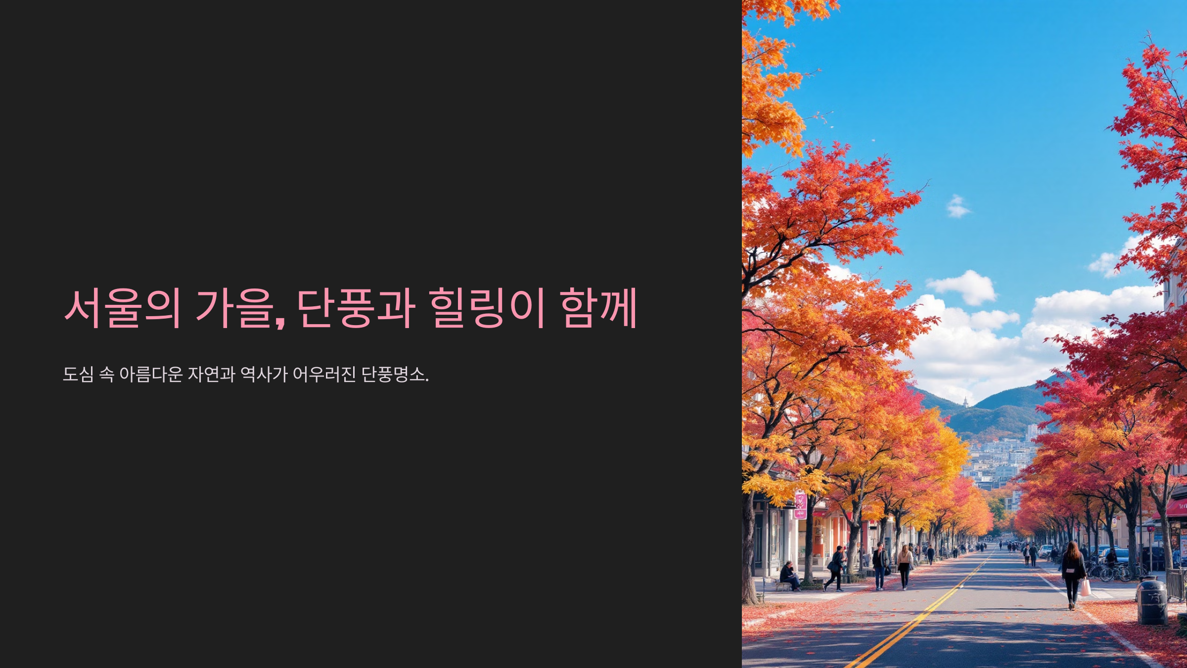 서울의 가을은 단풍으로 물드는 아름다운 자연과 도시의 조화가 돋보이는 계절입니다.