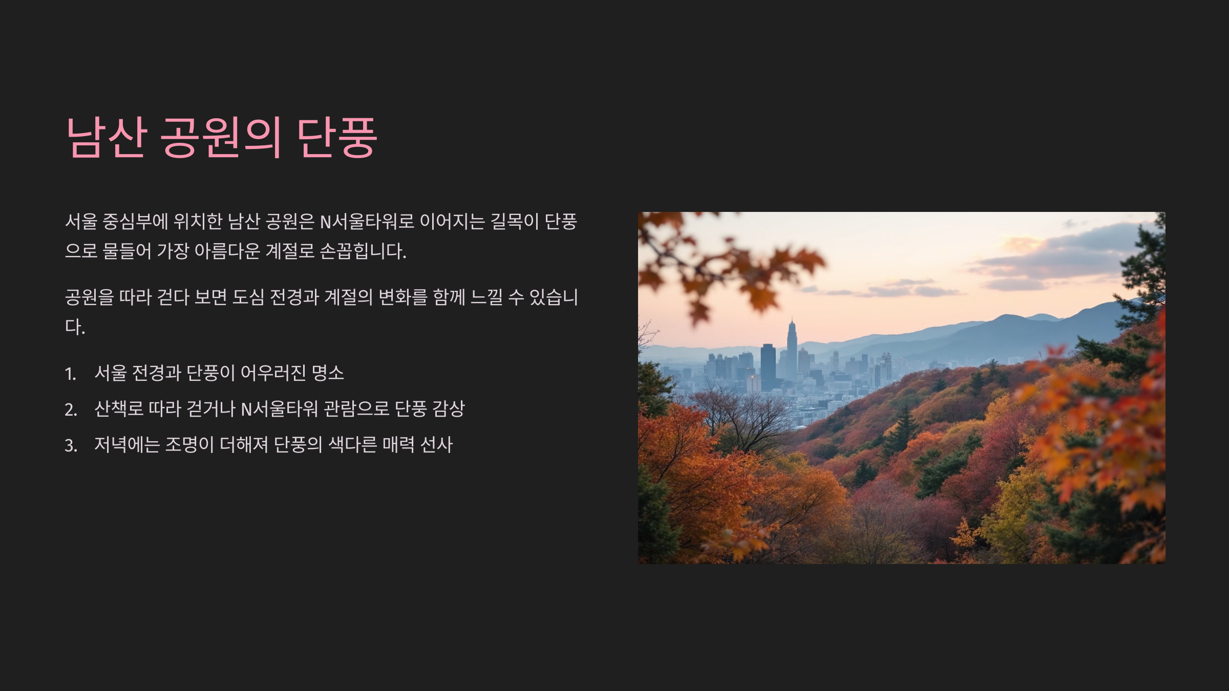 - 추천 활동: 산책로를 따라 걷거나 N서울타워를 관람하며 단풍 풍경을 감상.