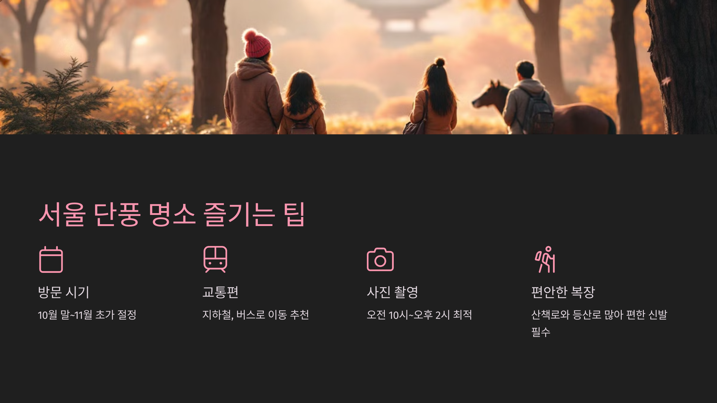 - 방문 시기 확인: 서울의 단풍은 10월 말에서 11월 초가 절정입니다.