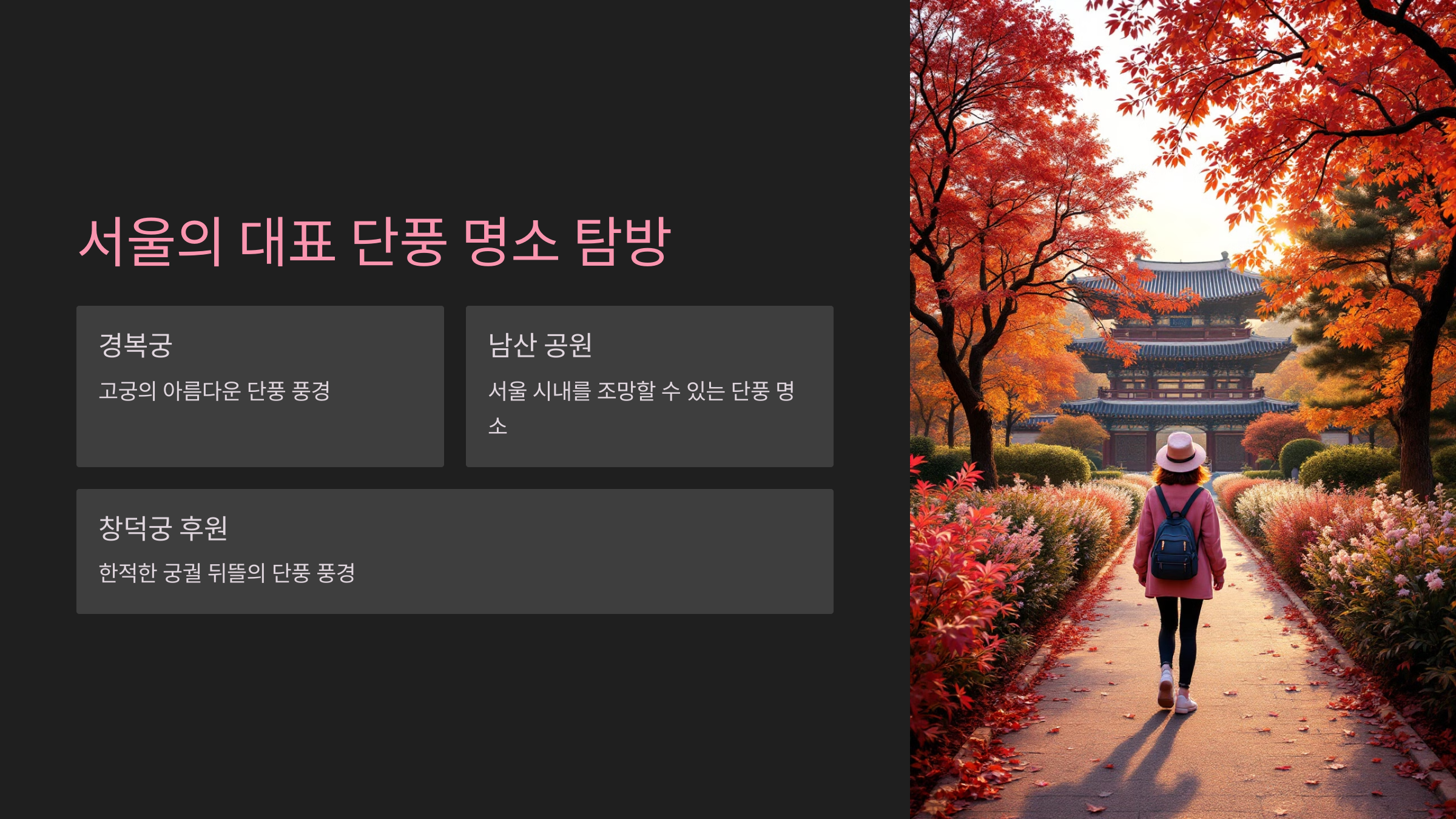 서울의 도심 곳곳에는 멀리 떠나지 않고도 단풍의 아름다움을 즐길 수 있는 명소들이 자리 잡고 있습니다.