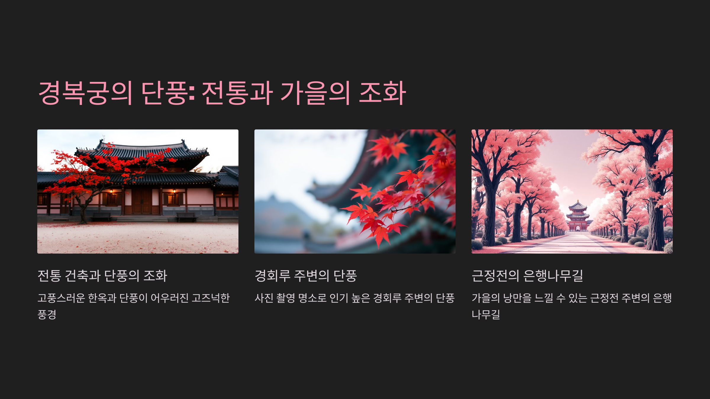각 명소는 단풍의 아름다움뿐만 아니라 역사적 가치, 문화적 매력, 그리고 자연의 조화로운 모습을 통해 방문객들에게 잊지 못할 경험을 선사합니다.
