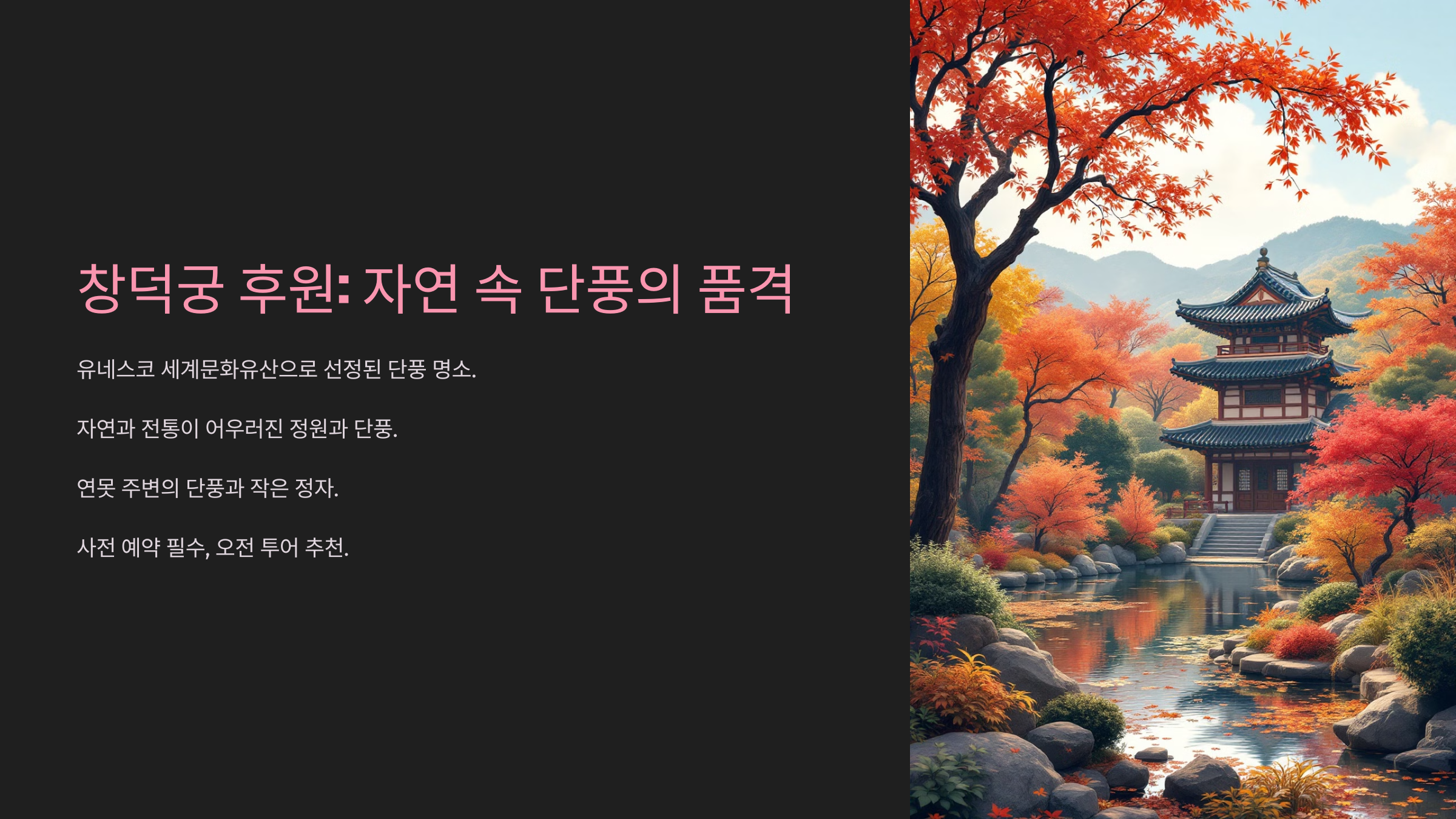 - 팁: 한복 착용 시 무료 입장이 가능하며, 단풍 절정기는 보통 10월 말에서 11월 초입니다.