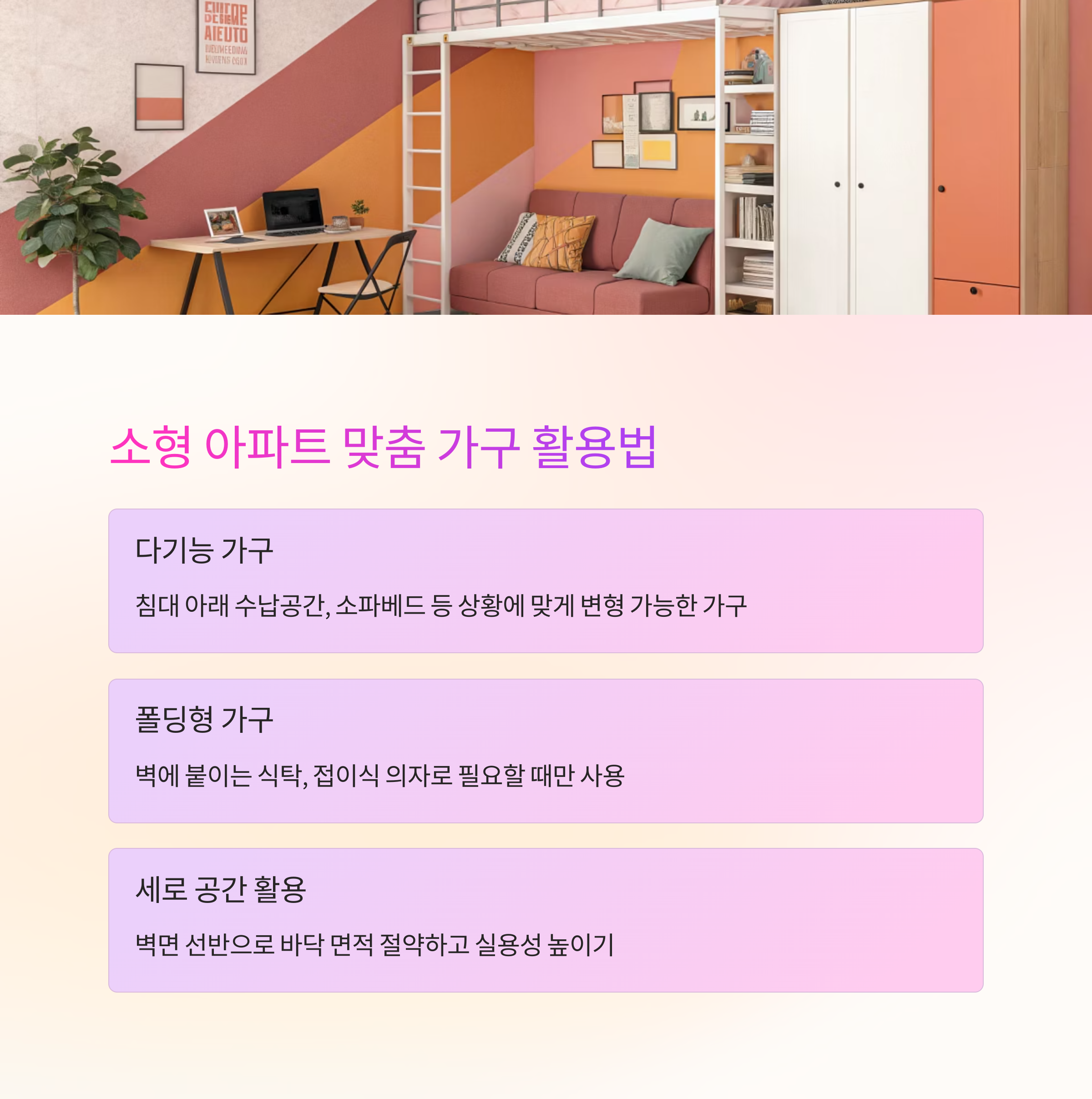 소형 아파트에서 가장 중요한 건 '맞춤형 가구 선택'이에요. 모든 가구를 다 들이기보다는 다기능을 갖춘 스마트 가구 위주로 선택하면 공간 절약에 큰 도움이 돼요. 예를 들어, 침대 아래 수납공간이 있는 제품이나, 소파베드처럼 상황에 따라 바꿔 쓸 수 있는 가구가 인기 많아요.