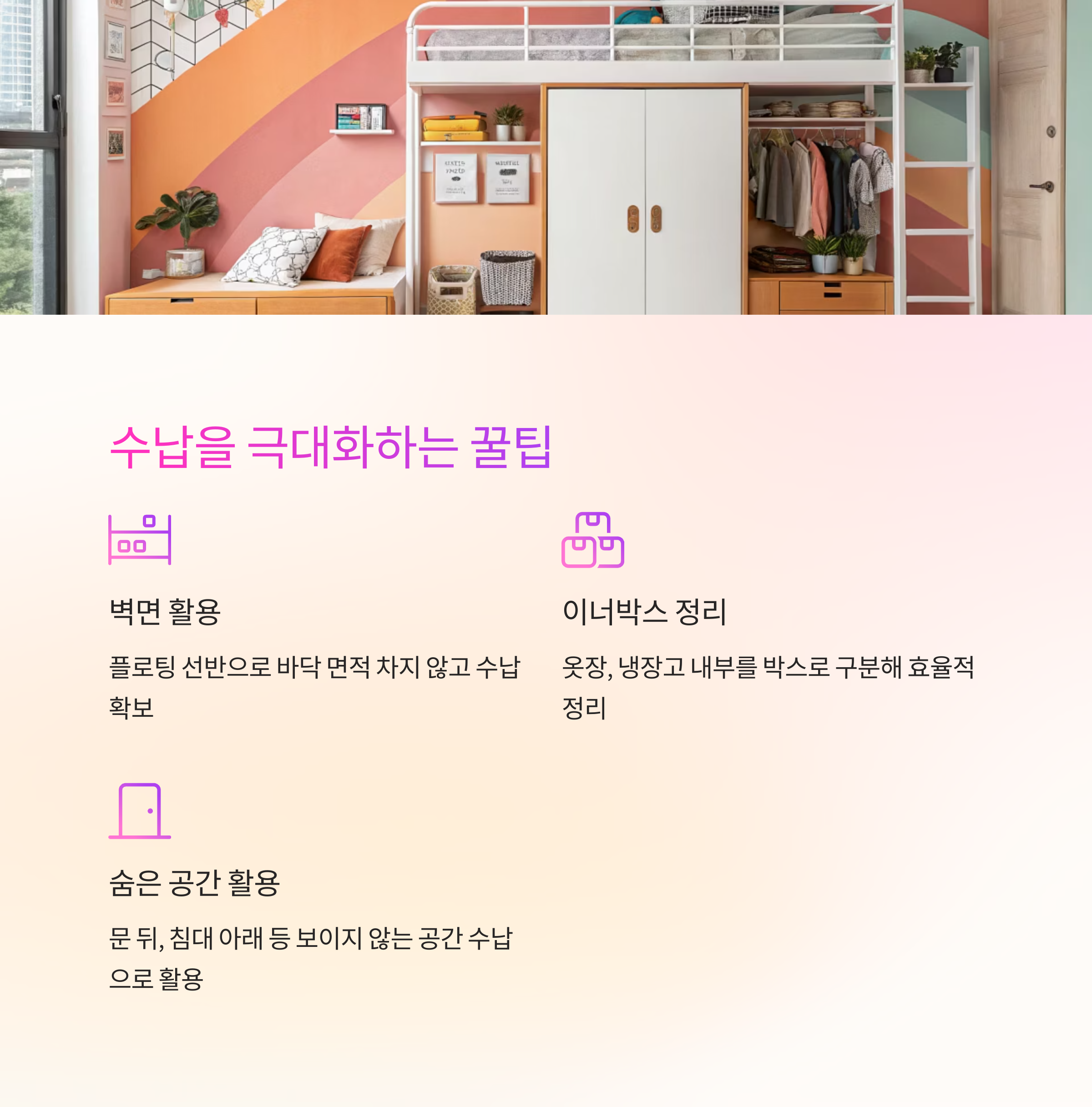 옷장 안에도 수납을 늘리는 아이템을 활용하면 좋아요. 이너박스, 걸이형 수납포켓, 이중 옷걸이 레일 등을 활용하면 같은 공간도 두 배로 쓸 수 있답니다. 특히 침대 아래는 수납함으로 가득 채워야 손해 보지 않아요!