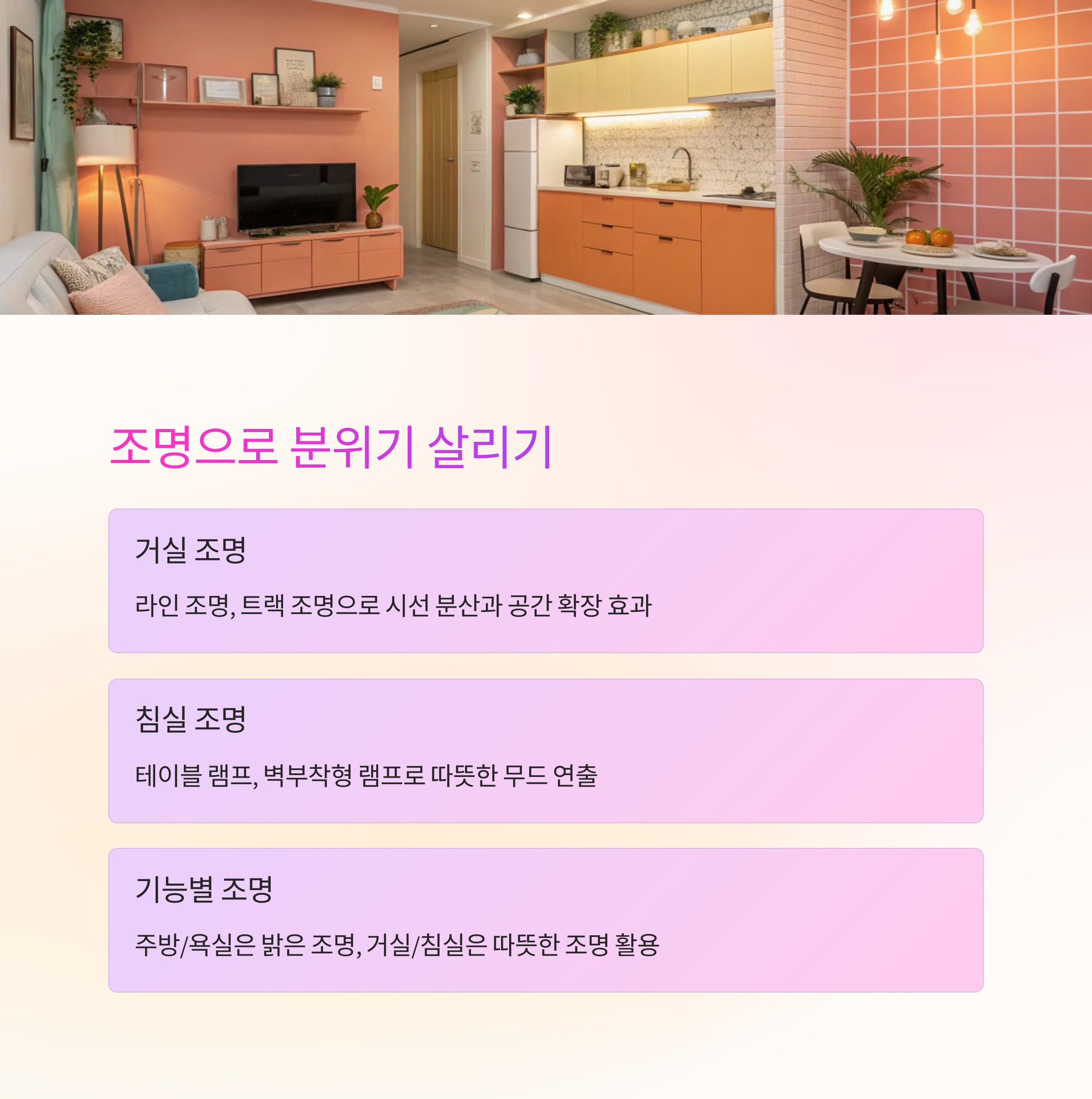세종 소형 아파트에서는 자연광이 부족한 구조도 많기 때문에 조명을 잘 활용하는 게 정말 중요해요. 가장 기본은 직부등이나 천장등이지만, 공간마다 포인트 조명을 배치하면 훨씬 따뜻한 분위기를 연출할 수 있어요.
