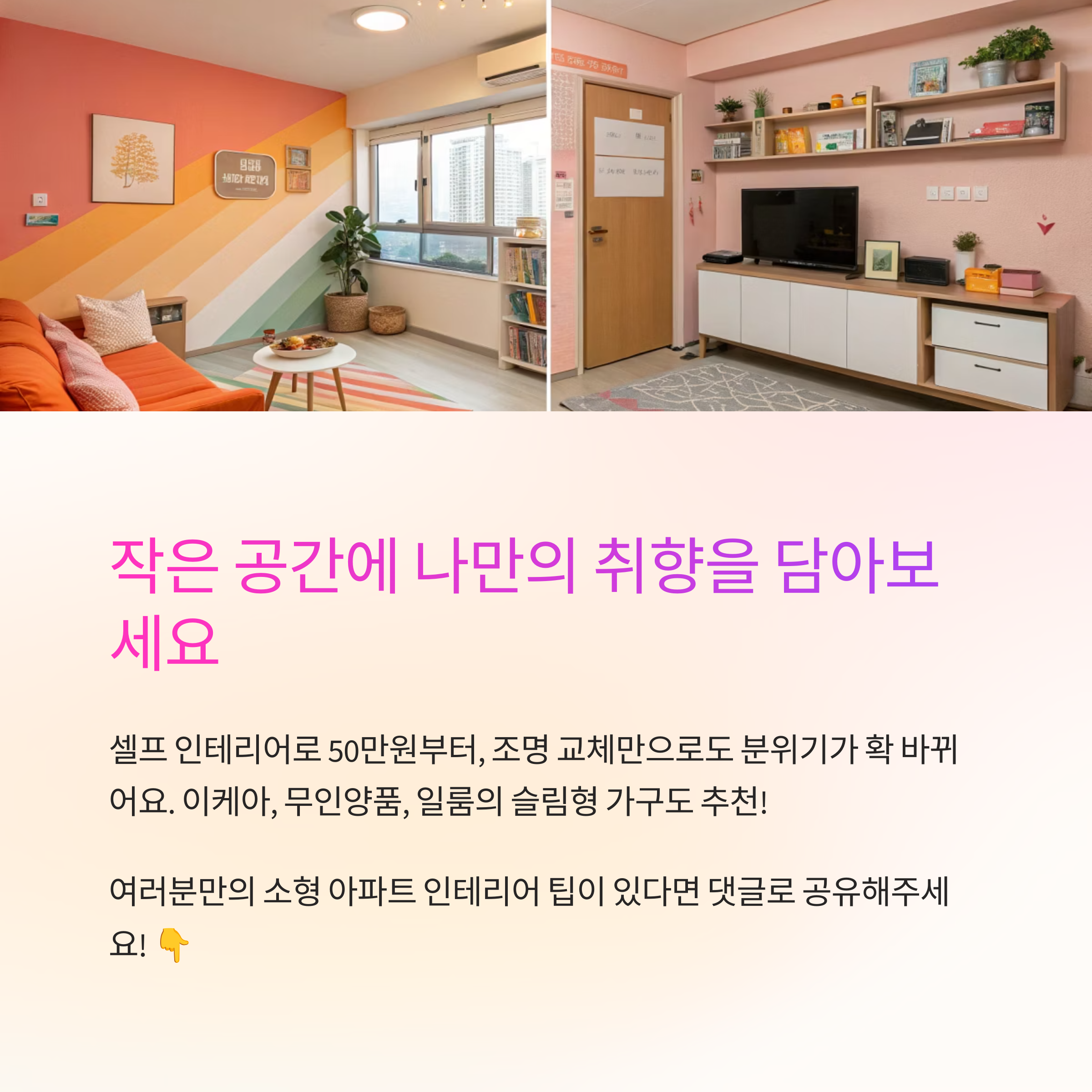 소형 공간일수록 ‘적게 두고 크게 꾸미기’가 핵심이에요. 예쁜 오브제 몇 개만으로도 분위기를 확 살릴 수 있어요. 큰 그림 하나, 특별한 조명 하나면 공간 전체가 바뀐답니다.