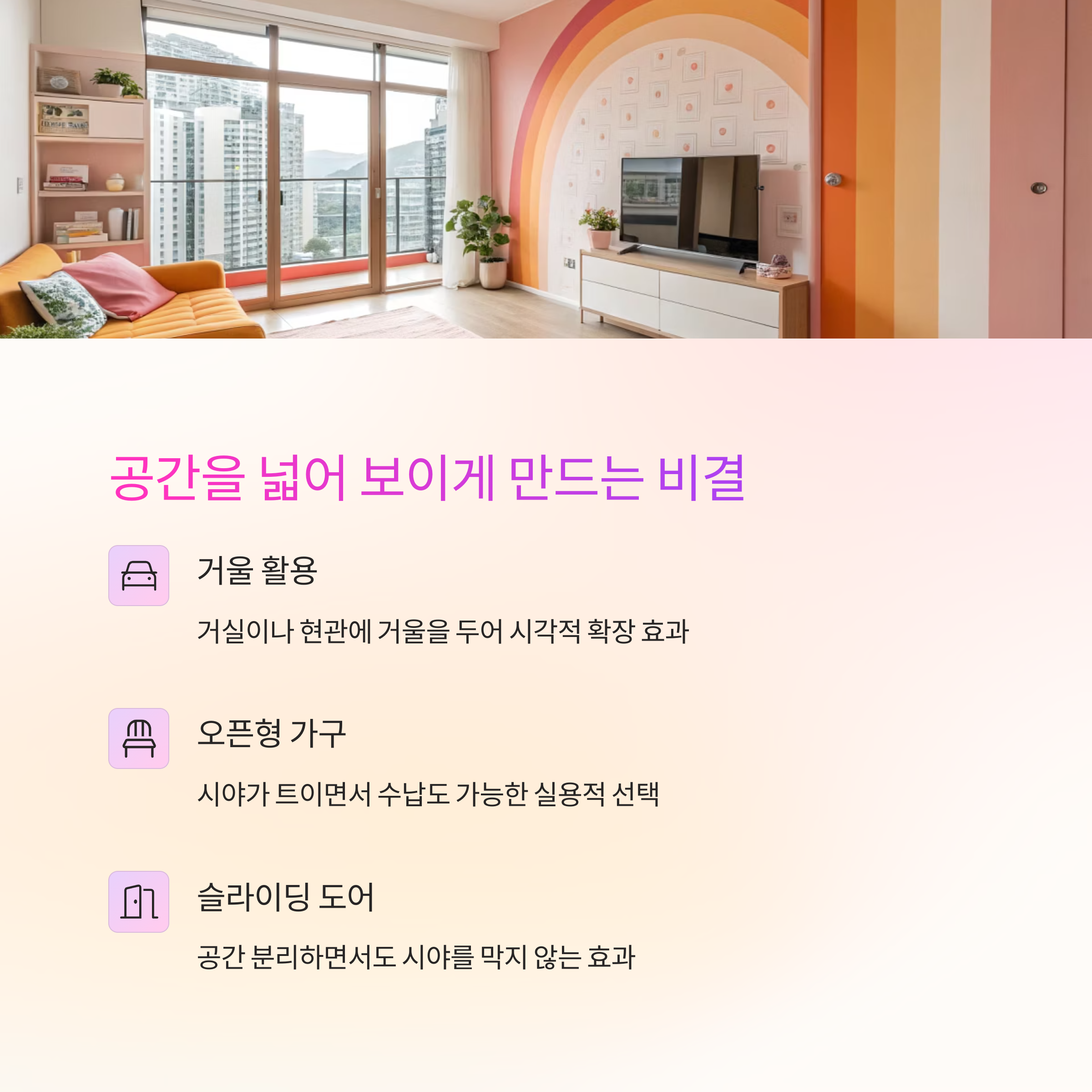 소형 아파트에서는 ‘시각적인 공간 확장’이 중요해요. 벽을 허물 수 없다면 가구 배치나 컬러 톤, 거울 등을 활용해 확장 효과를 줄 수 있죠. 특히 거울은 넓어 보이는 착시 효과를 주기 때문에 거실이나 현관에 활용하면 훨씬 시원한 느낌이 들어요.