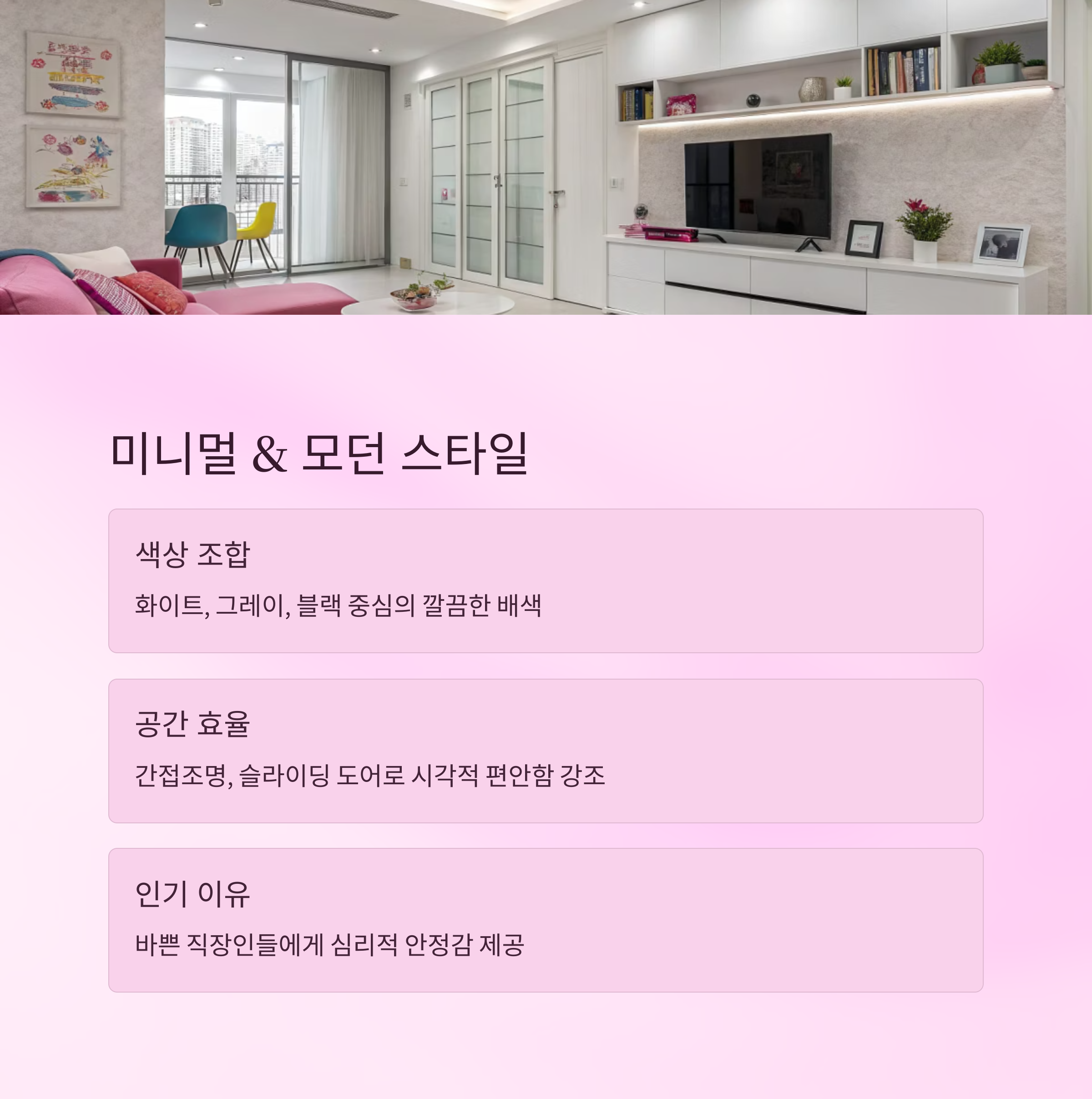 이런 스타일은 맞벌이 부부나 직장인들에게 특히 인기가 많아요. 군더더기 없이 정돈된 공간은 일상에 여유를 주고, 바쁜 생활 속에서도 심리적인 안정을 가져다주기 때문이에요.