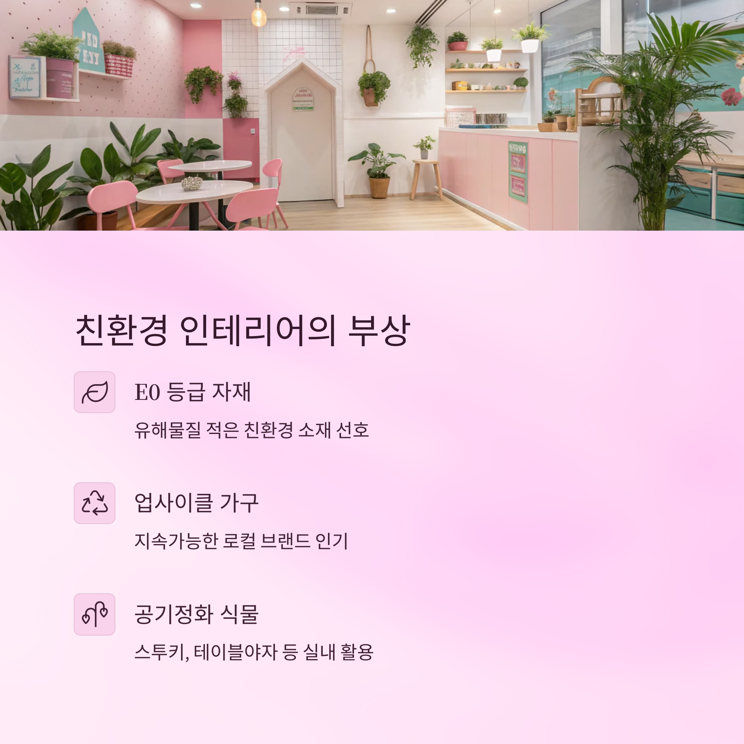 친환경 인테리어는 단순히 ‘좋은 일’이 아니라, 실질적으로 건강에도 도움이 되는 선택이에요. 유해물질이 적은 E0 등급 자재, 친환경 도료, 공기 정화 식물 등을 사용하는 가구들이 많아졌어요.