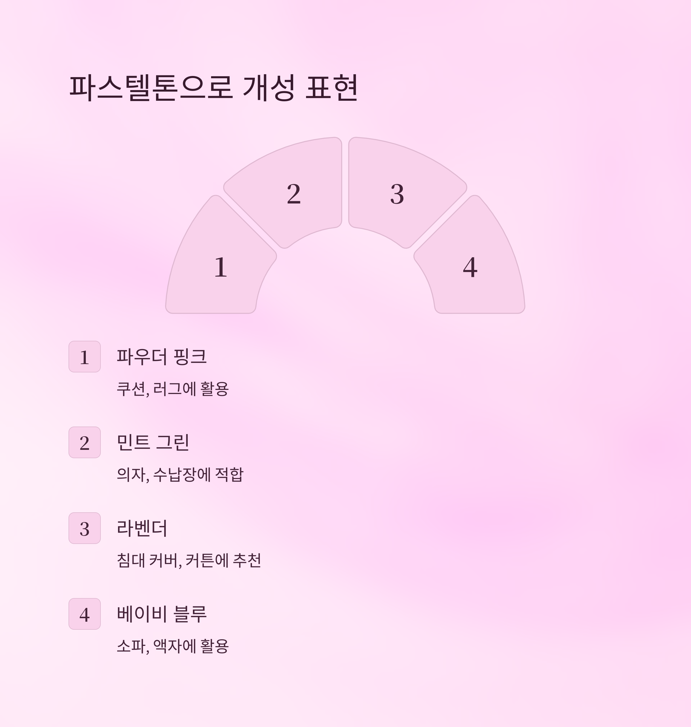 파스텔 컬러는 벽지, 커튼, 소품 등에서 가장 많이 쓰여요. 특히 베이비 블루 소파나 라일락 커튼은 감성을 자극하면서도 부담스럽지 않은 분위기를 만들어주기 때문에 인기가 많아요.