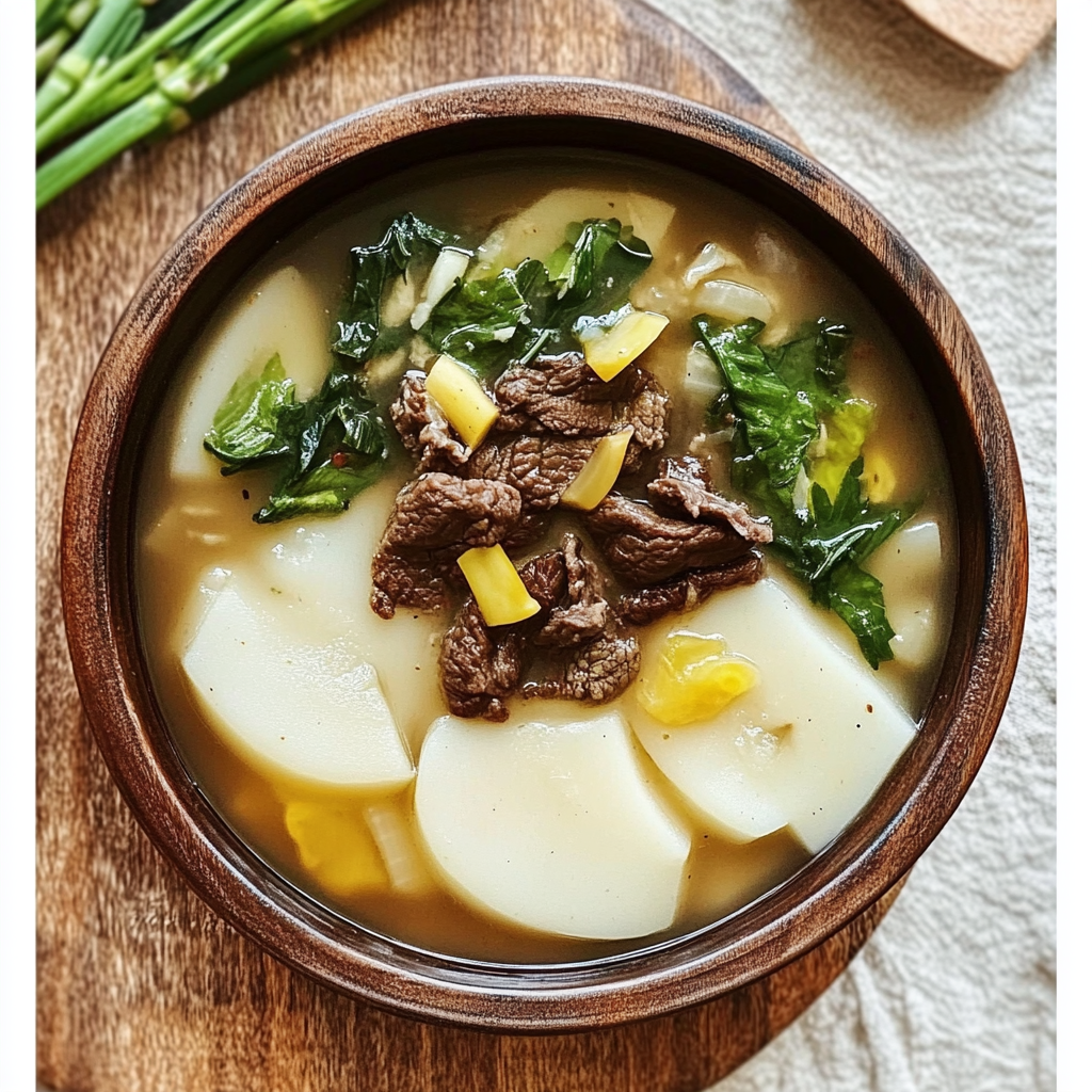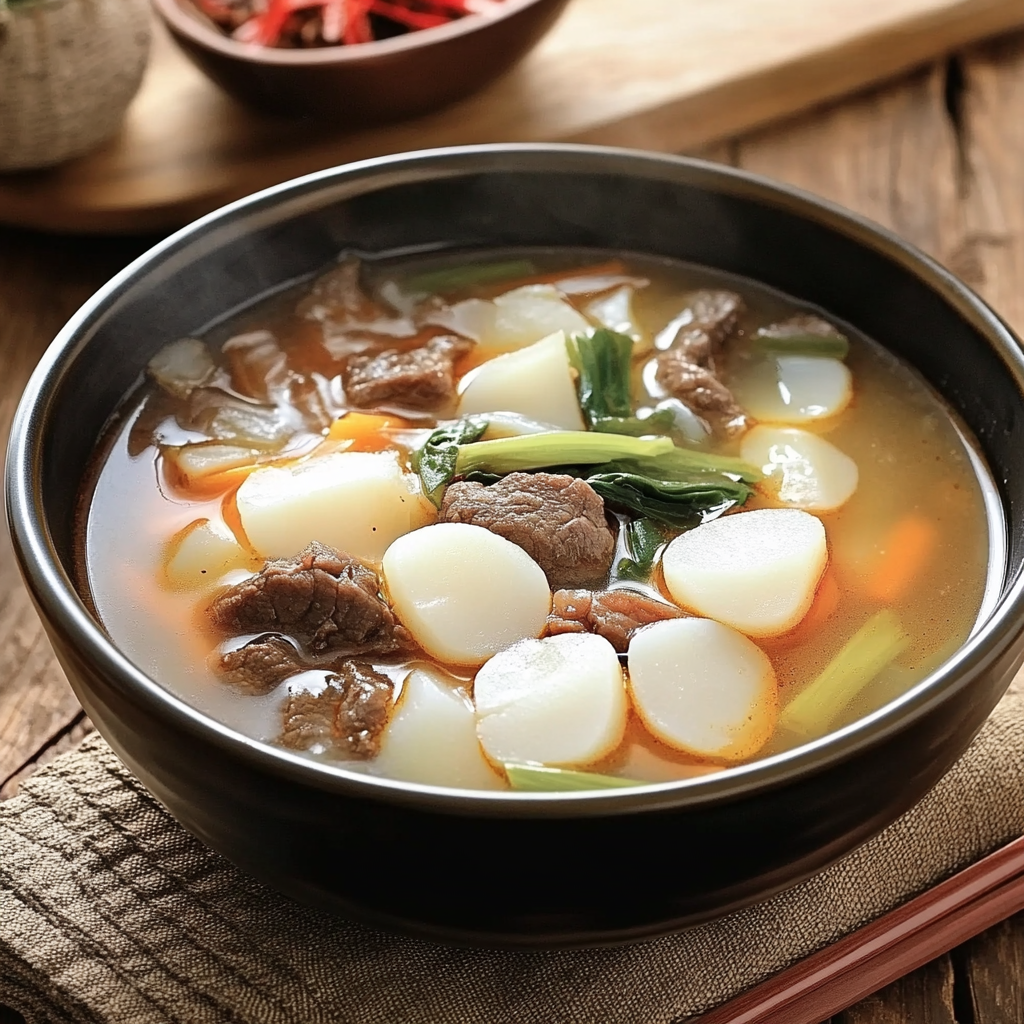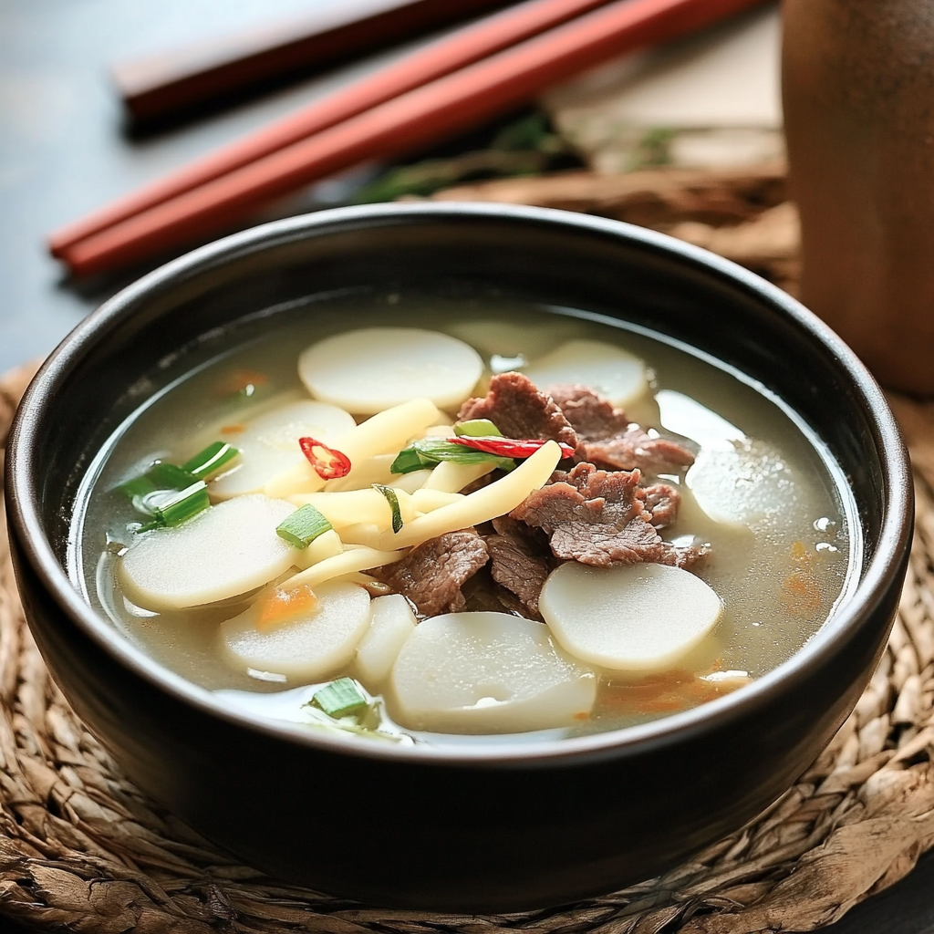 - 준비된 소고기를 넣어 떡과 함께 부드럽게 조리하며, 필요에 따라 소금과 후추로 간을 조정합니다.