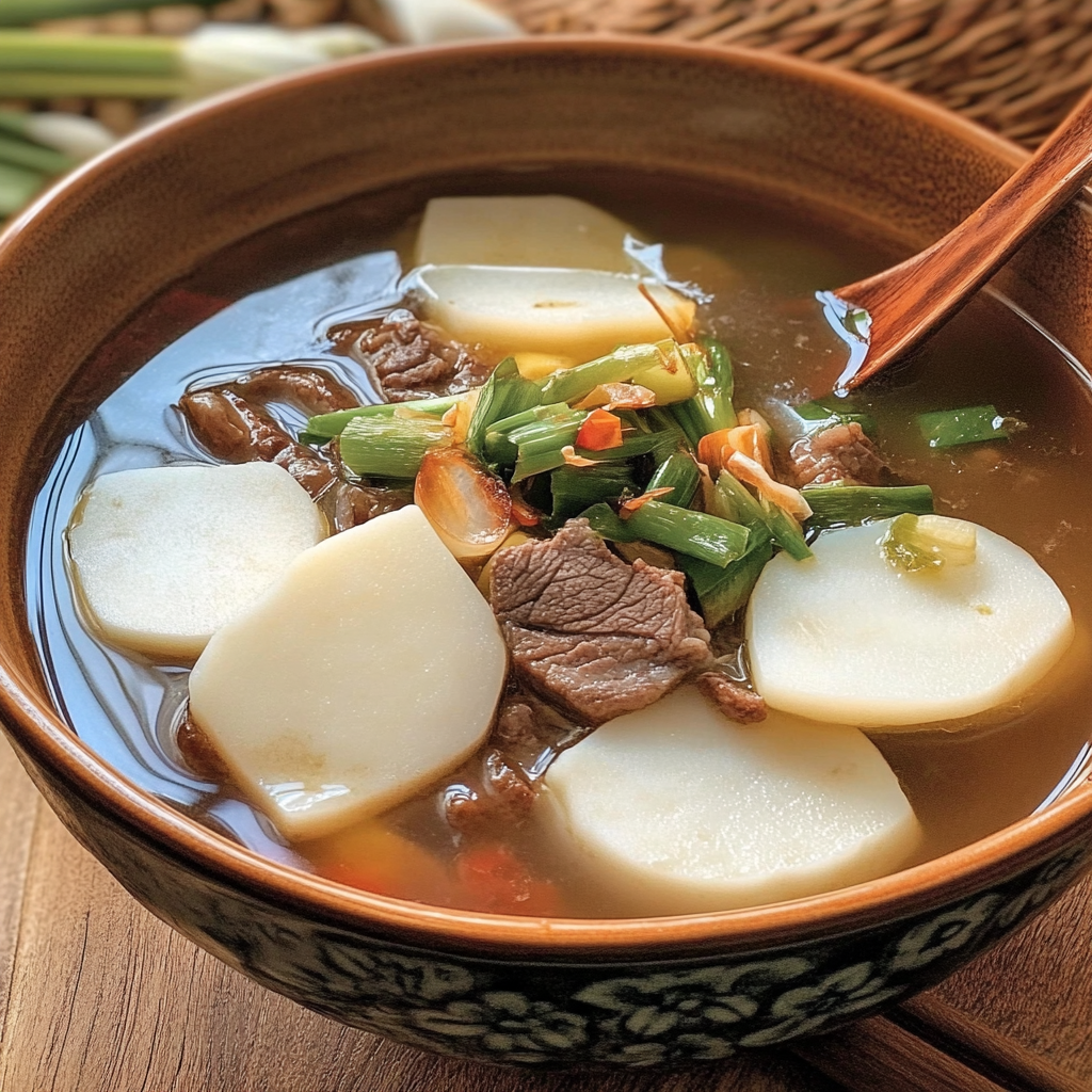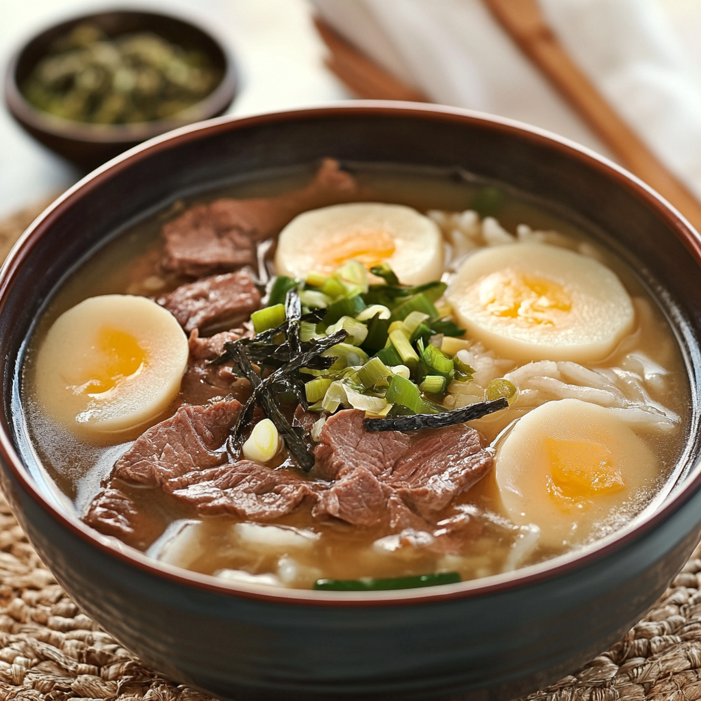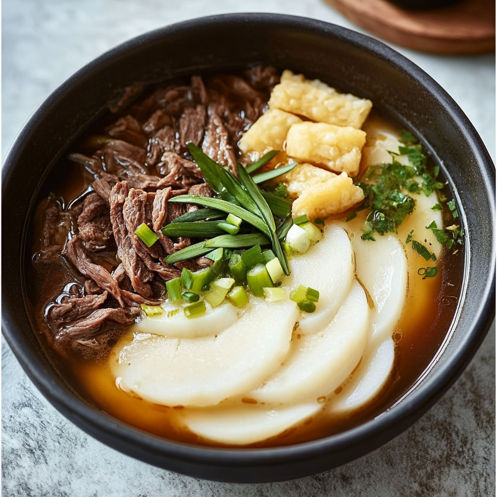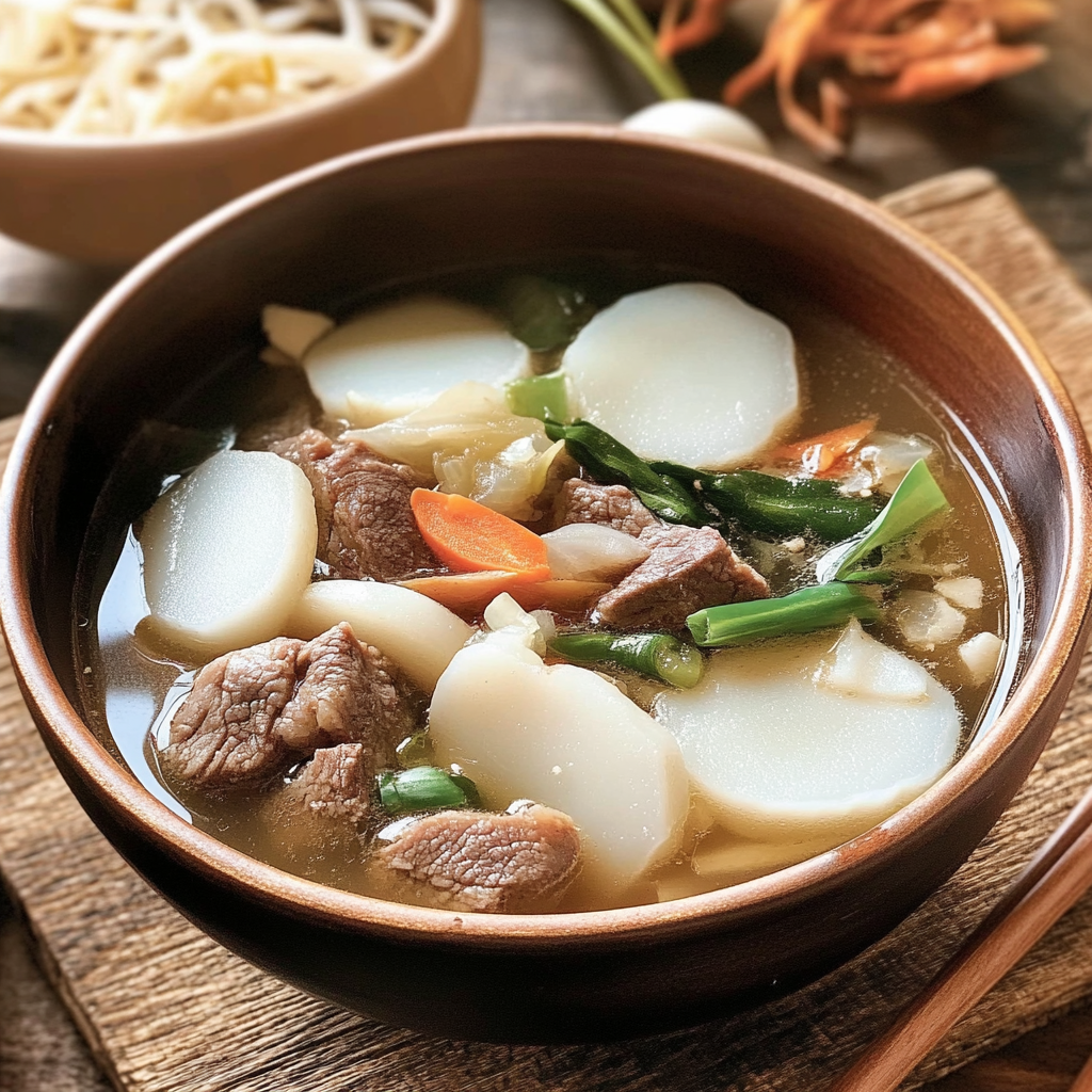 - 준비된 소고기를 넣어 떡과 함께 부드럽게 조리하며, 필요에 따라 소금과 후추로 간을 조정합니다.