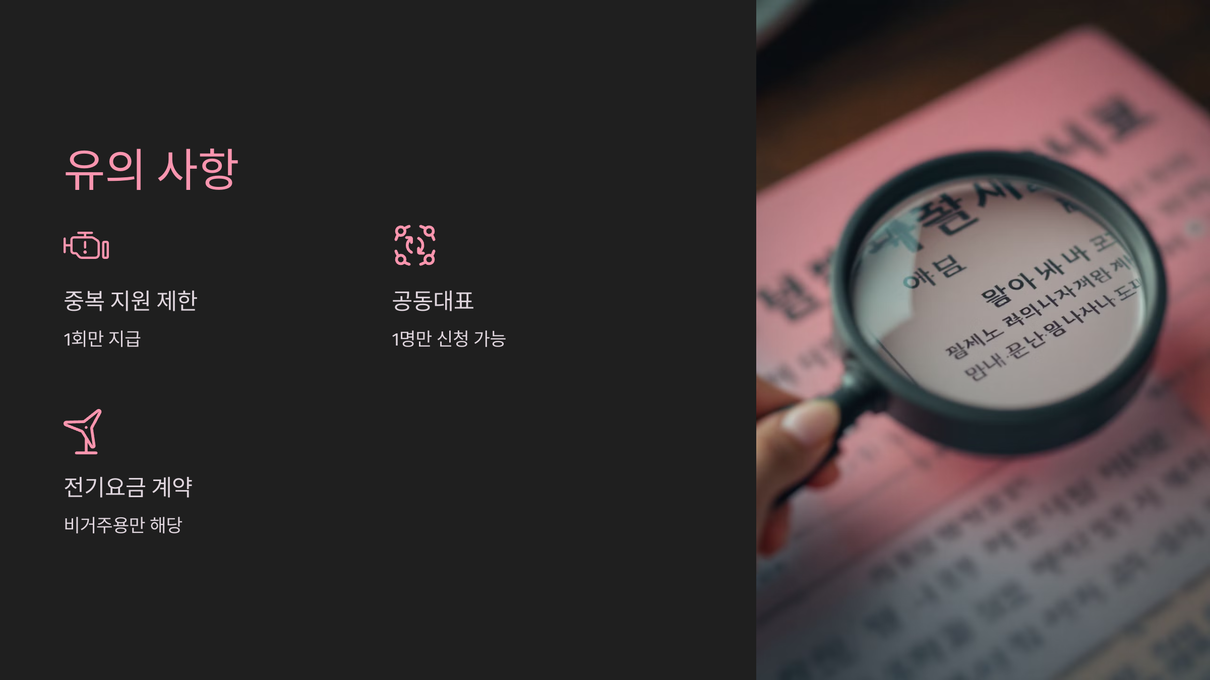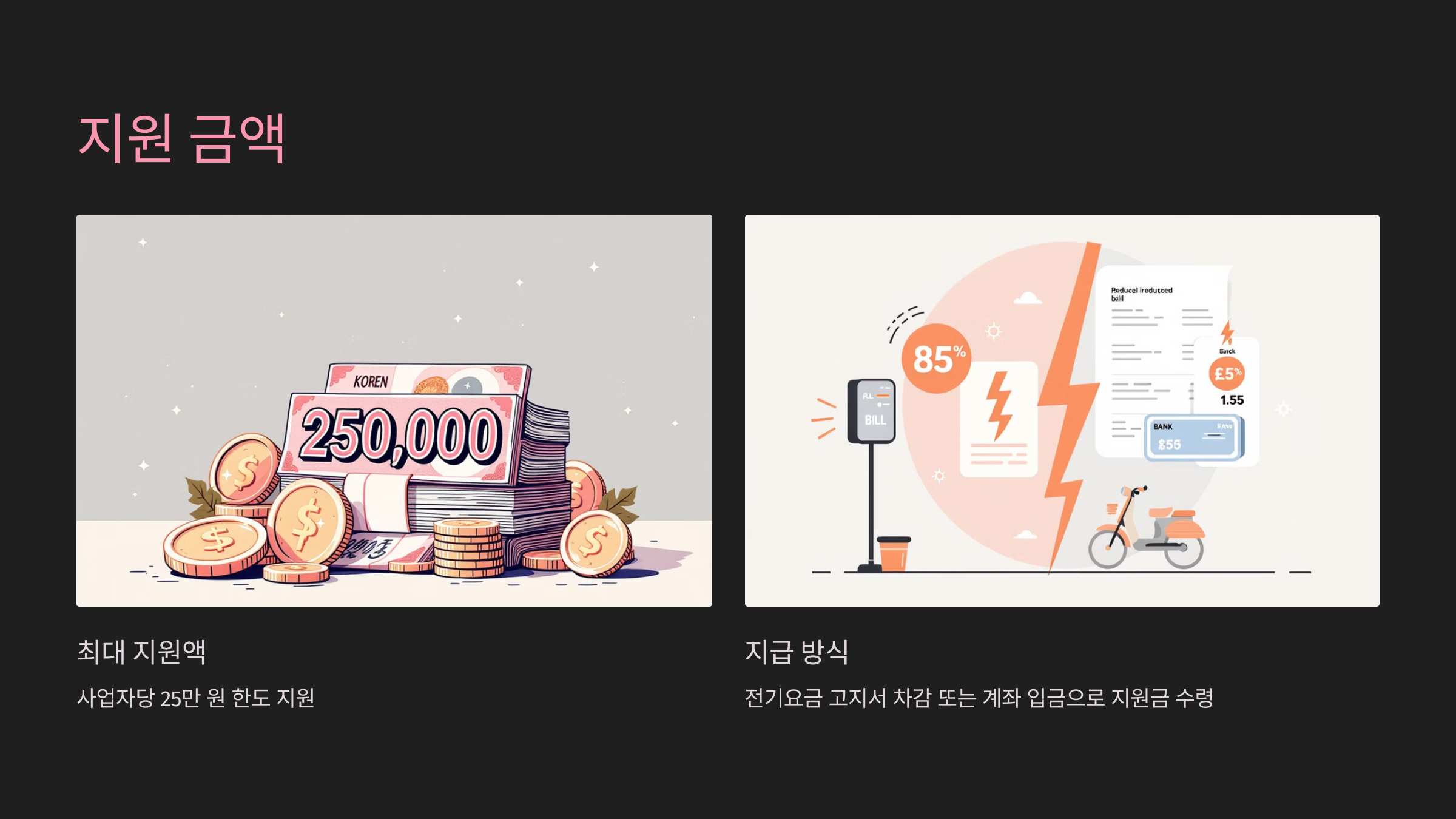 1. 전기요금 고지서 차감 방식: 한국전력과 직접 계약된 사업자의 경우, 매월 고지서에서 지원 금액이 자동 차감됩니다.