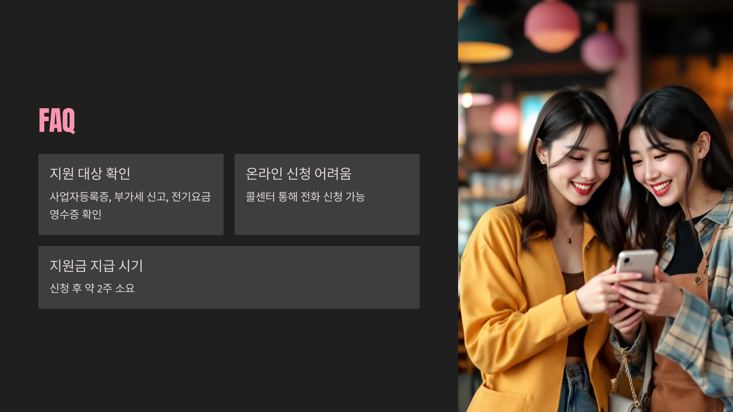 - 전용 웹사이트 [소상공인전기요금특별지원.kr](https://소상공인전기요금특별지원.kr)에서 신청 가능