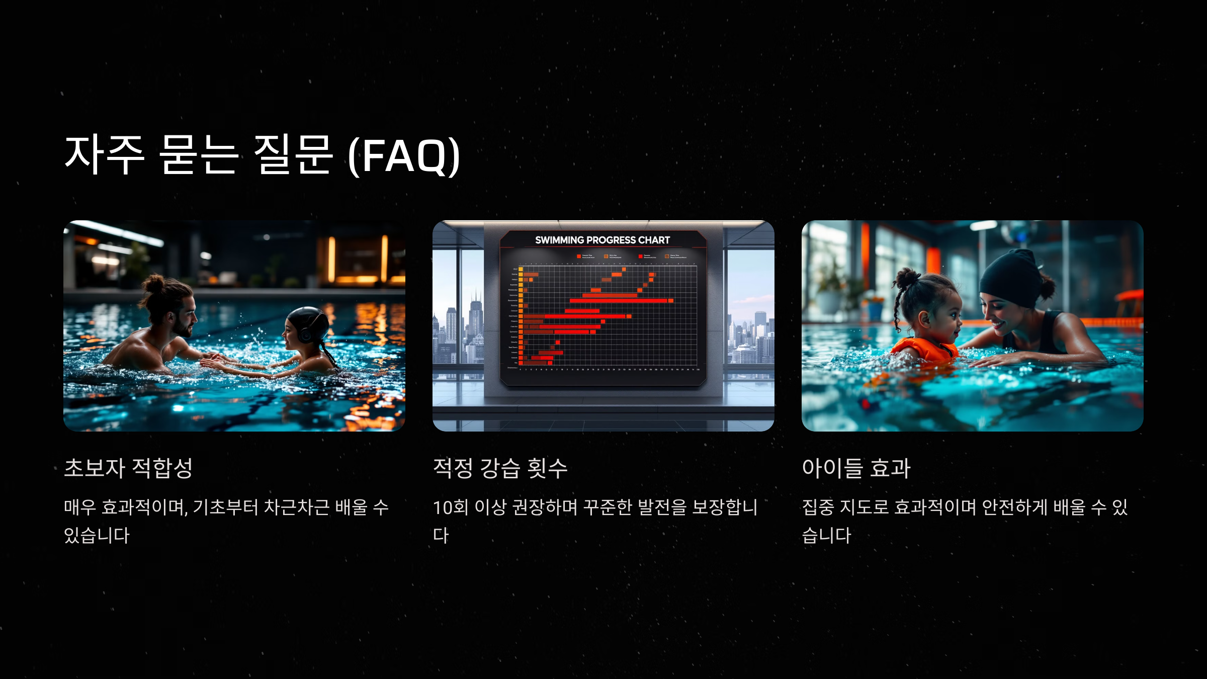 마지막으로, 강습 중 강사와의 직접적인 소통이 원활해 수영 기술뿐만 아니라 전반적인 운동 습관까지 교정받을 수 있는 장점이 있어요.