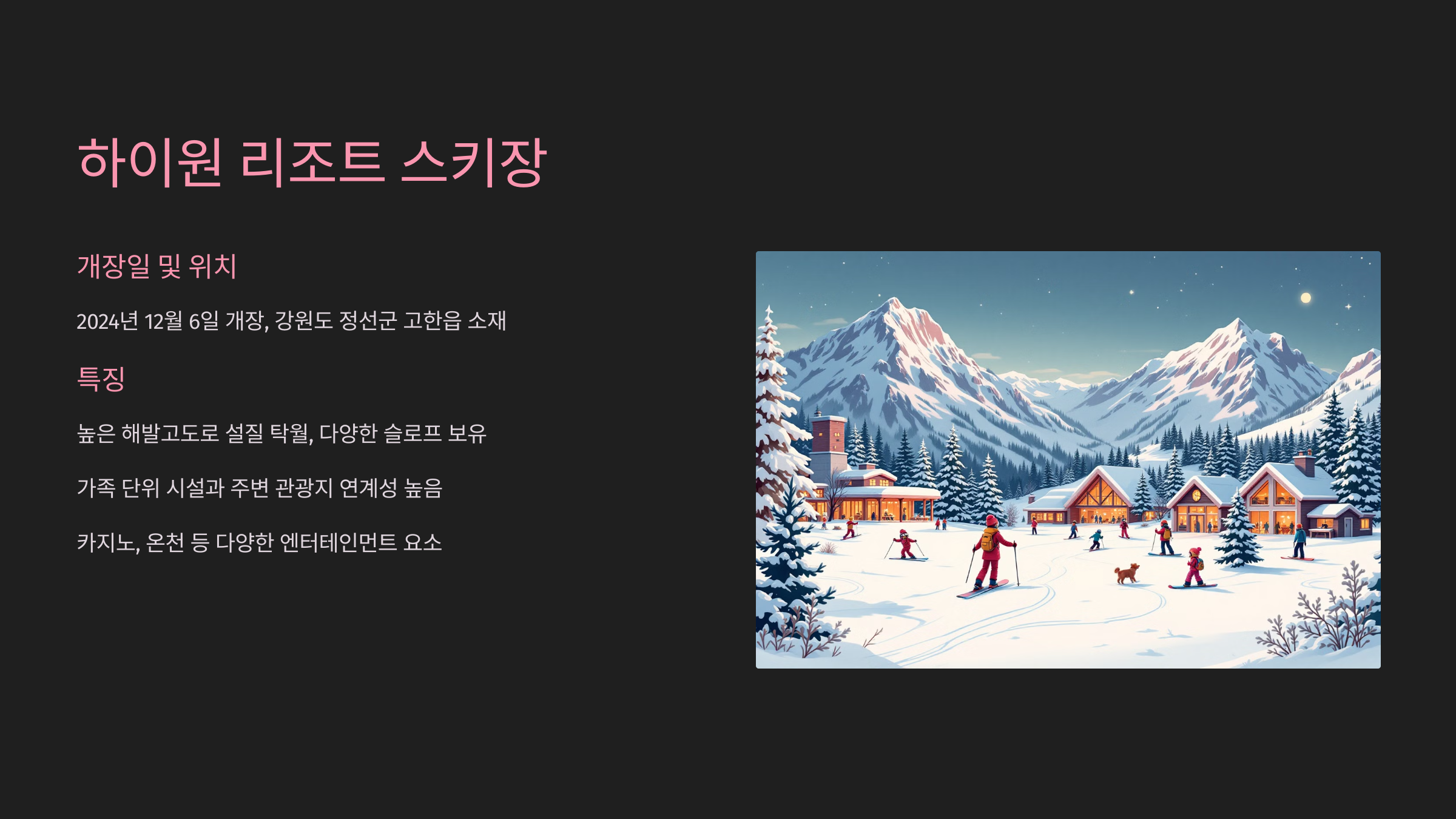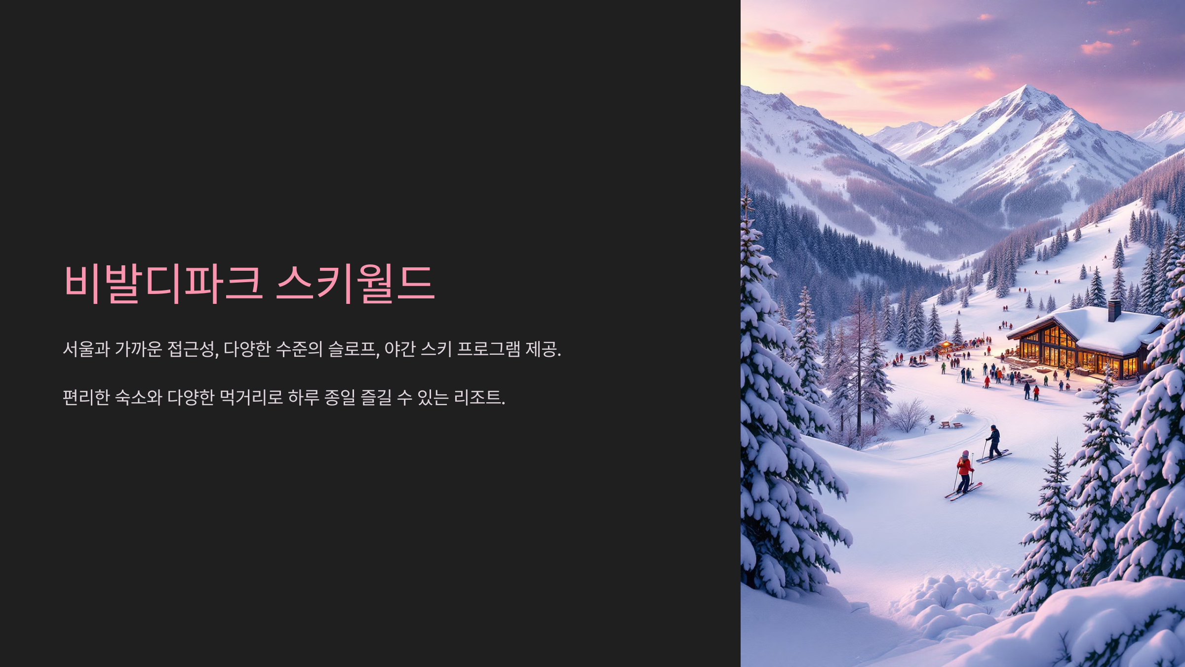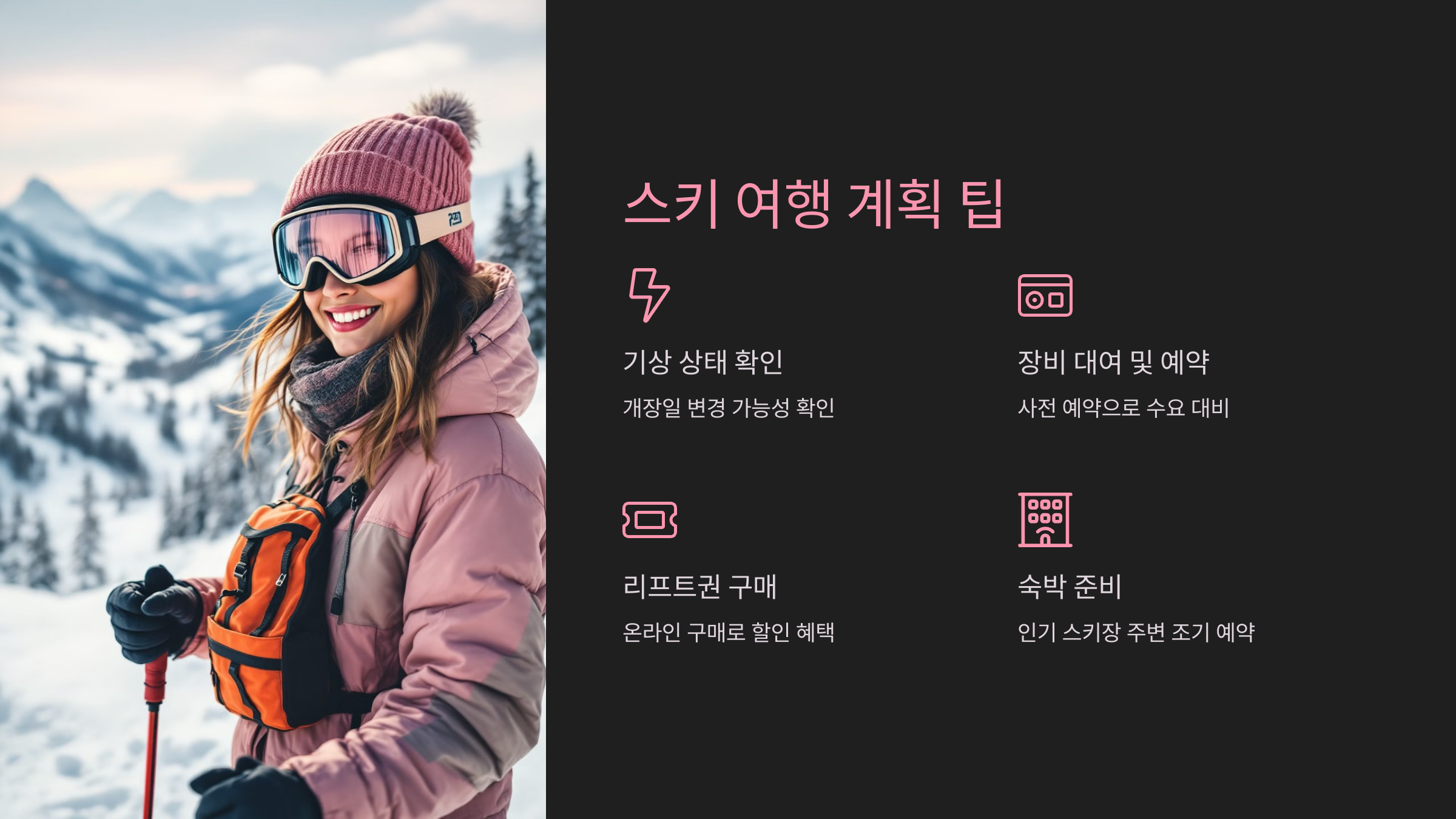 - 장비 대여 및 예약: 스키 장비는 시즌 중에 수요가 많으니 사전에 예약하세요.