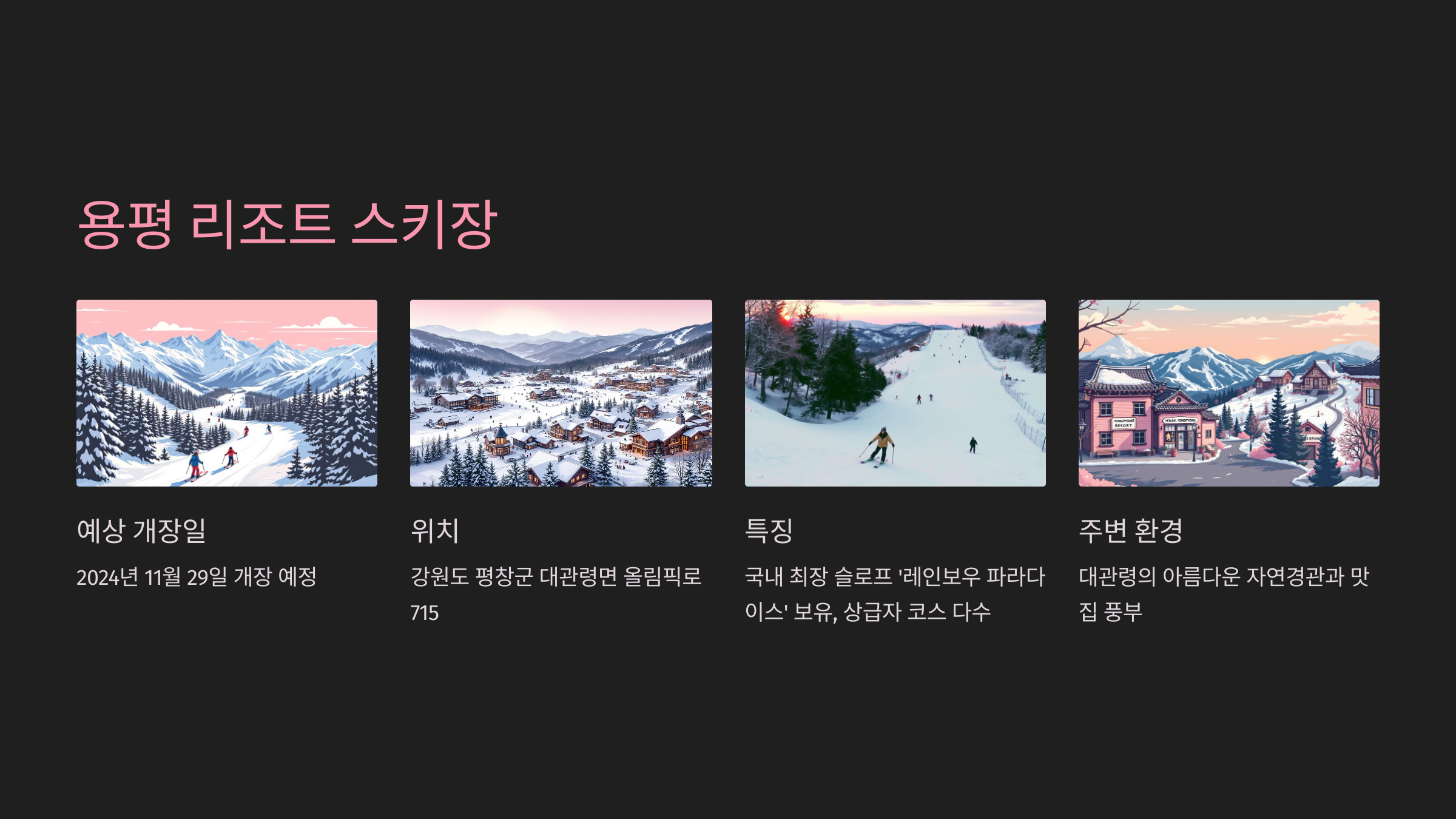 국내에서 가장 긴 슬로프인 '레인보우 파라다이스'를 보유한 용평 리조트는 국내외 스키어들이 즐겨 찾는 명소입니다. 상급자 코스가 많아 도전적인 경험을 원하는 이들에게 이상적이며, 초보자를 위한 전용 슬로프와 안전 강습도 제공됩니다. 리조트 주변에는 대관령의 아름다운 자연환경과 맛집이 많아 스키 외에도 풍성한 여행 경험을 선사합니다. 리조트 내 다양한 겨울 액티비티도 마련되어 있어 방문객의 만족도를 더욱 높입니다.