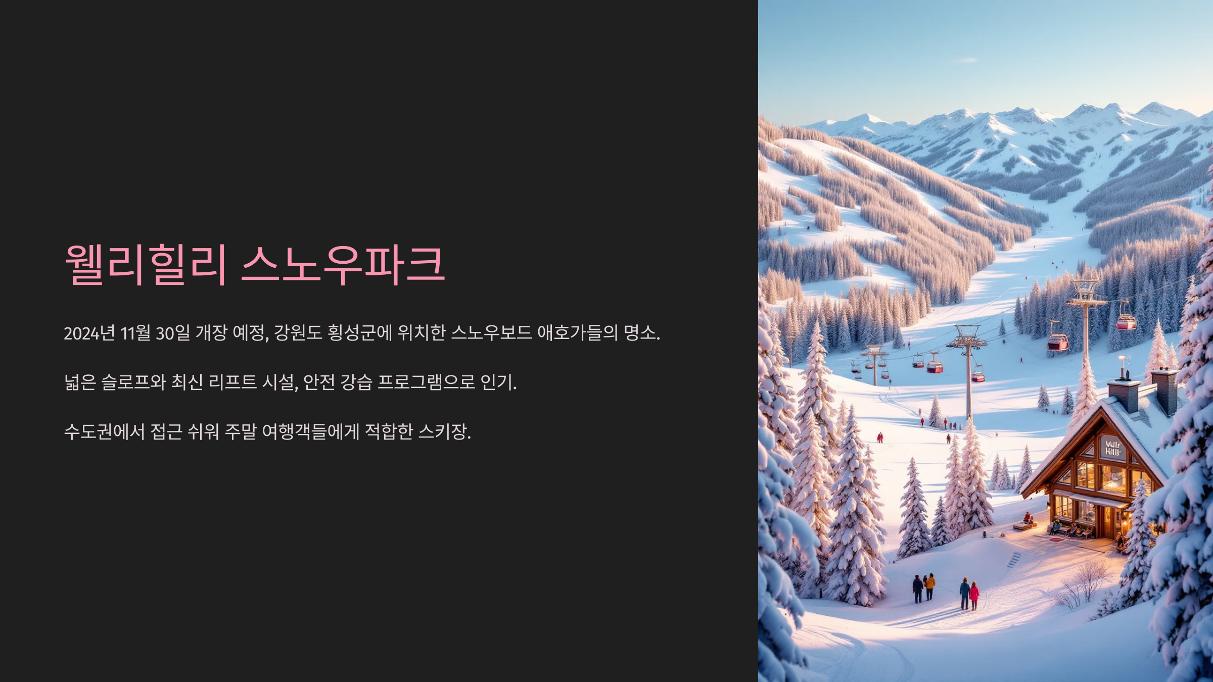 스노우보드 애호가들에게 특히 유명한 웰리힐리 스노우파크는 넓은 슬로프와 최신 리프트 시설로 사랑받는 스키장입니다. 수도권에서 접근하기 쉬워 주말 여행객들에게 적합하며, 초보자를 위한 안전 강습 프로그램도 체계적으로 운영됩니다. 겨울철 안전을 최우선으로 하는 관리 시스템은 방문객들에게 신뢰감을 주며, 리조트 내부의 편리한 시설은 더욱 편안한 스키 여행을 가능하게 합니다.