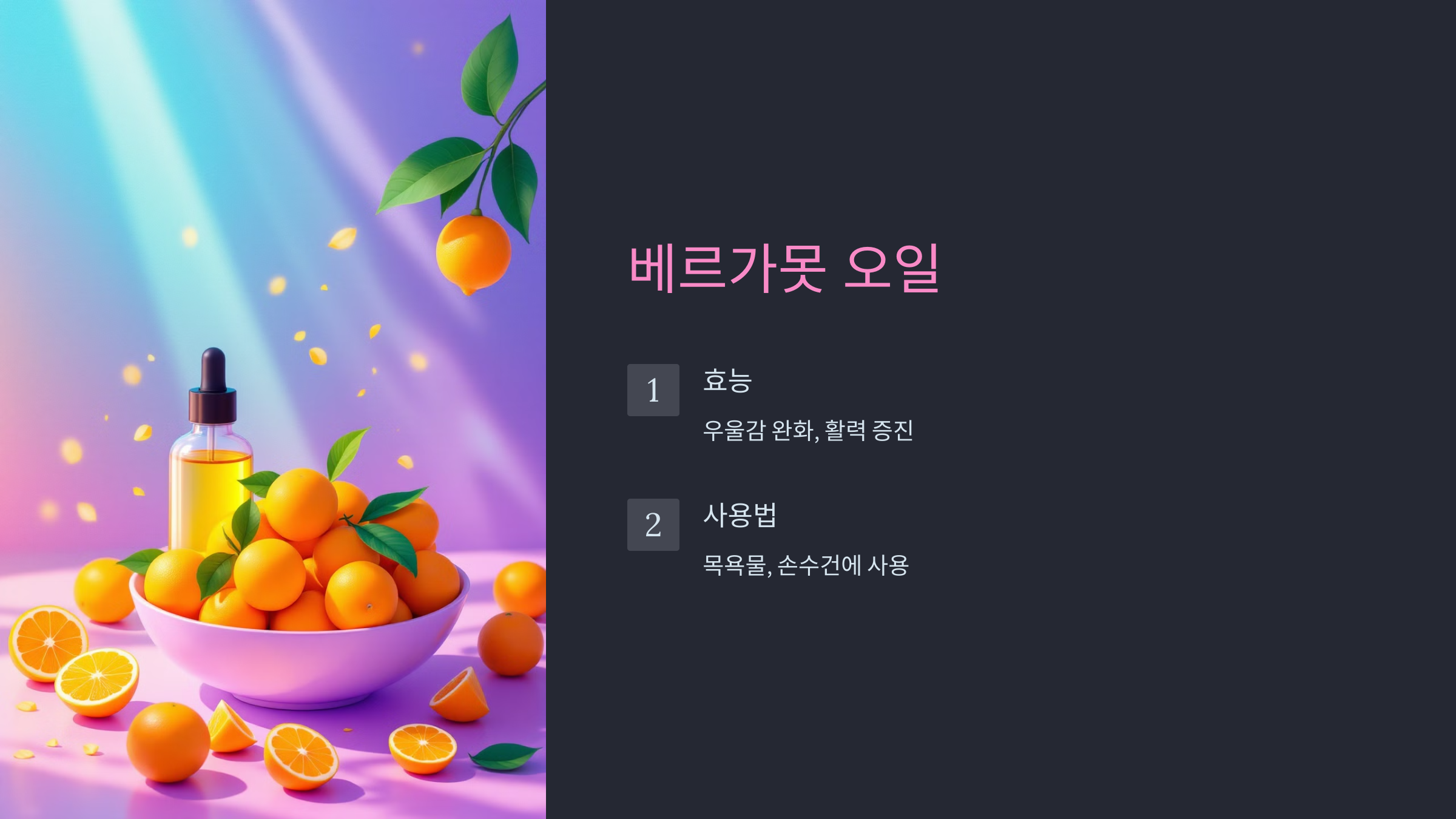 상큼한 시트러스 향이 나는 베르가못 오일은 우울감을 완화하고 기분을 향상시키는 데 효과적입니다. 특히 스트레스를 받아 마음이 가라앉을 때 상쾌한 기분을 되찾게 도와주는 향으로 추천됩니다.