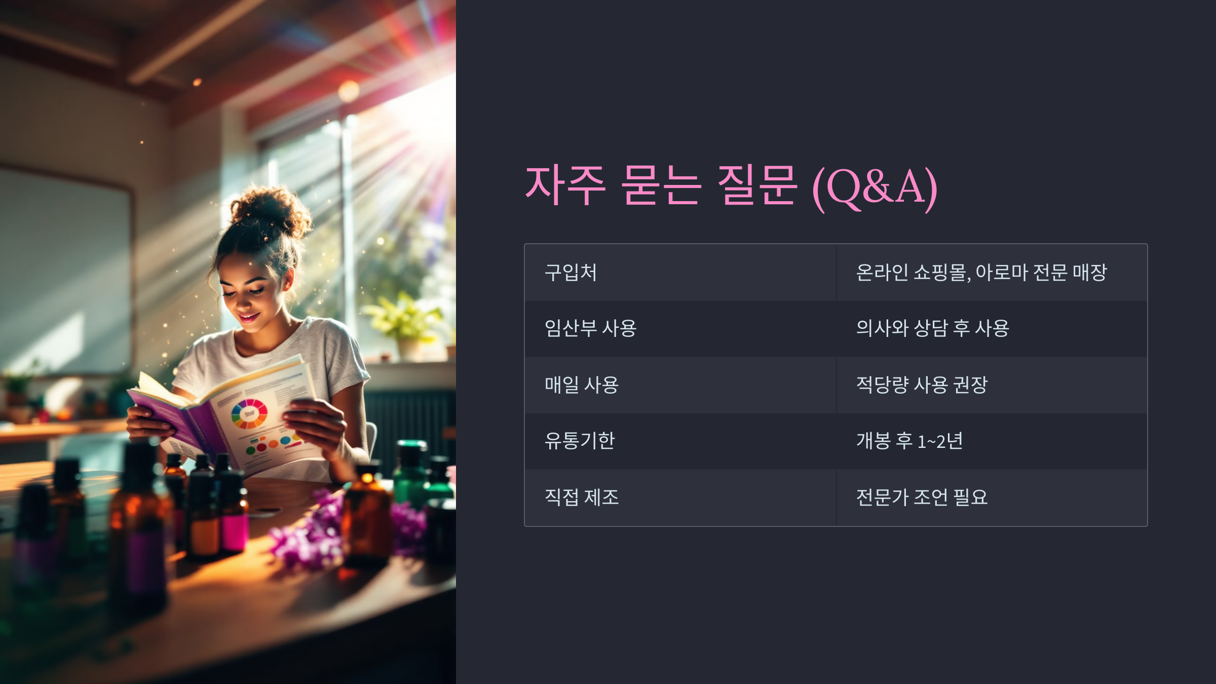 A1. 향기 오일은 온라인 쇼핑몰이나 아로마 전문 매장에서 쉽게 구입할 수 있으며, 브랜드와 성분을 꼼꼼히 확인하는 것이 중요합니다.