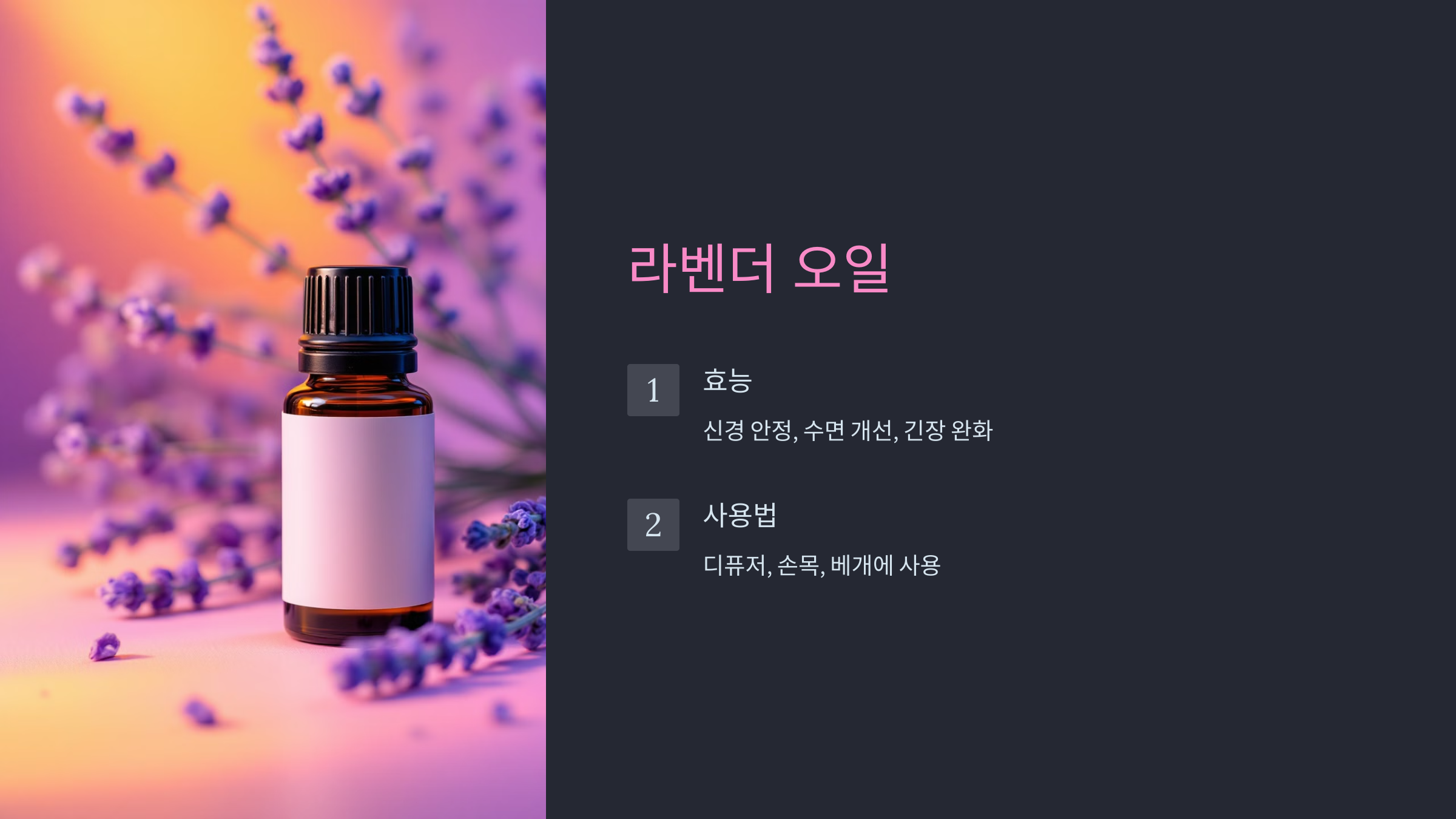 - 사용법: 마사지 오일에 섞어 사용하거나, 디퓨저에 몇 방울 떨어뜨려 향을 확산시킵니다.