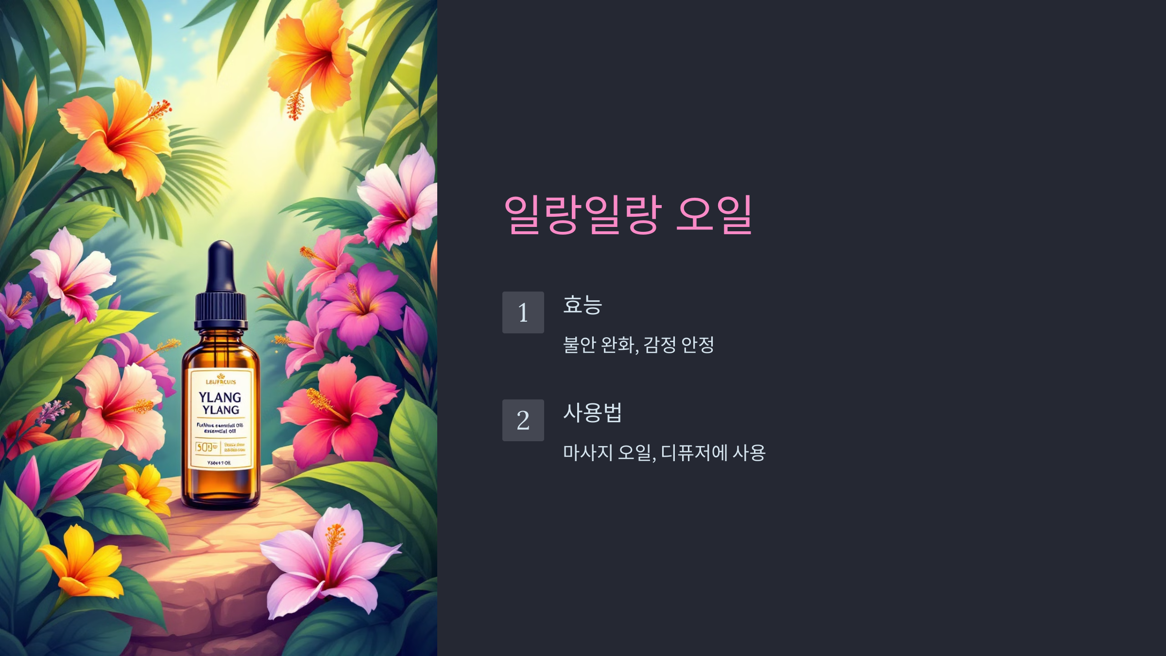 꽃향이 진한 일랑일랑 오일은 불안감을 해소하고 마음의 안정을 도와줍니다. 감정이 불안정하거나 과도한 긴장 상태에서 사용하는 것이 좋으며, 기분을 차분하게 만들어 스트레스를 덜어줍니다.