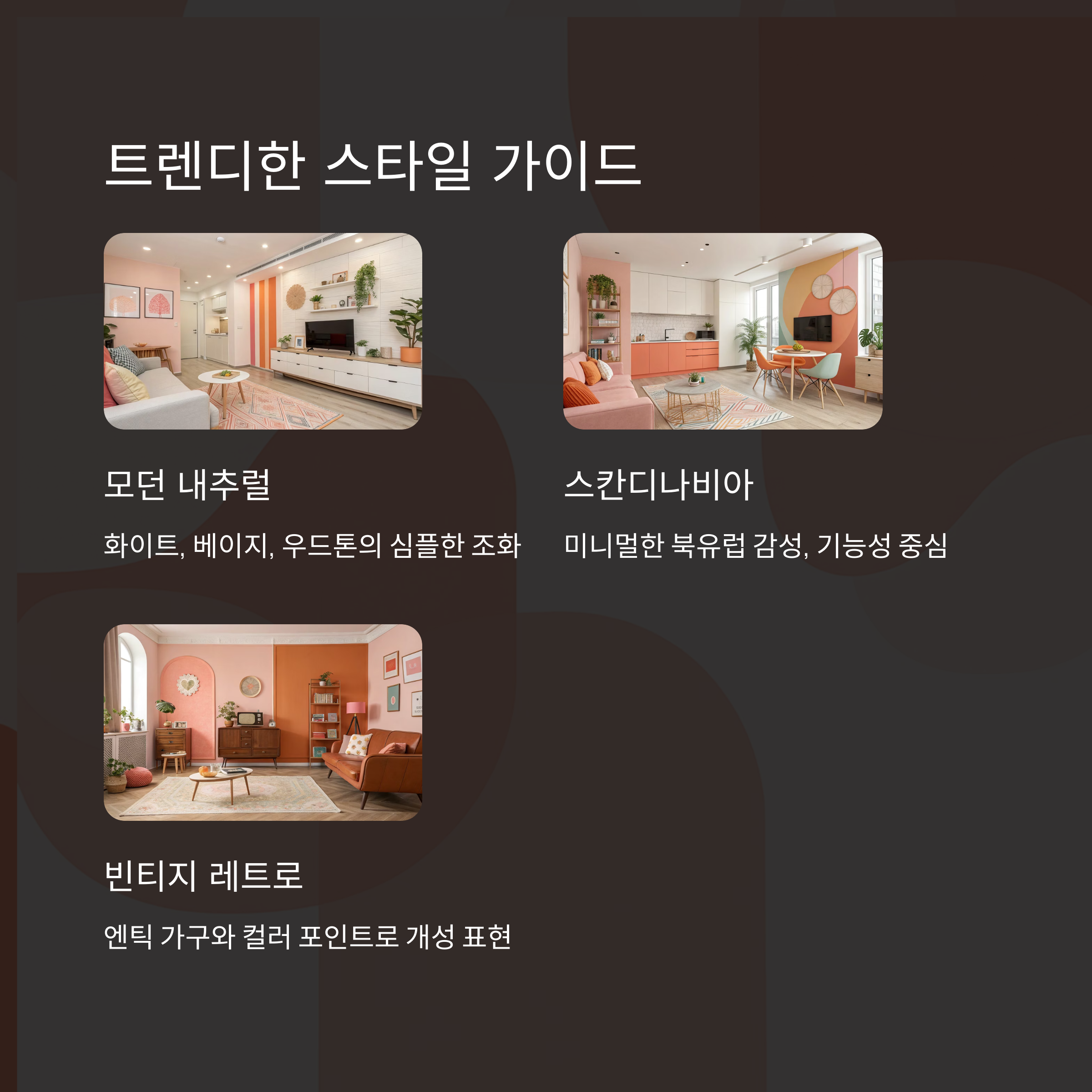 요즘 신혼부부들이 가장 많이 선택하는 스타일은 ‘모던 내추럴’, ‘스칸디나비아풍’, ‘빈티지&레트로’예요. 이 스타일들은 트렌디하면서도 오래 질리지 않아 꾸준한 인기를 끌고 있어요.